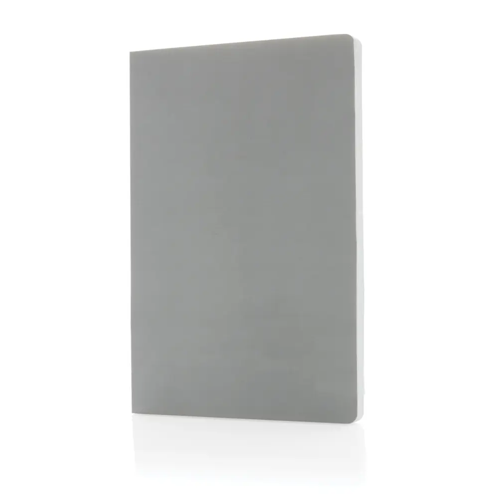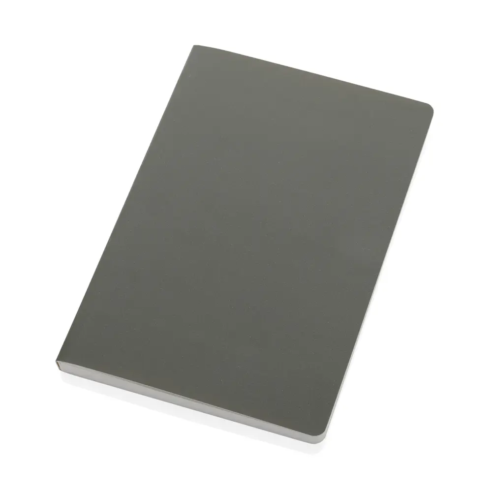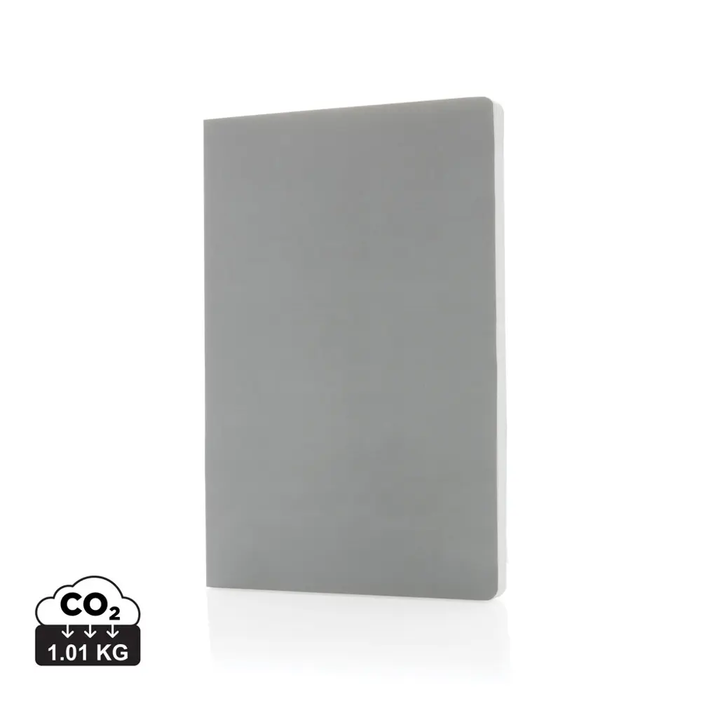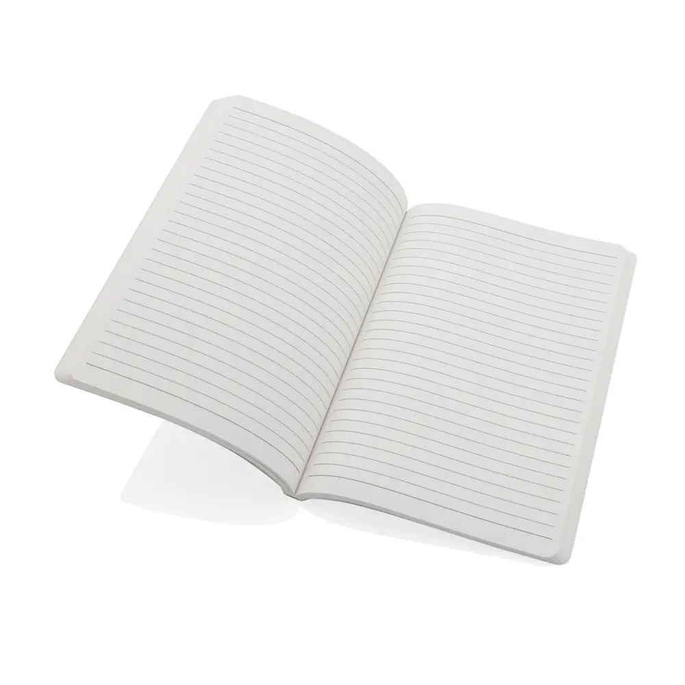 Ontdek ons Impact softcover steenpapier notitieboek in A5-formaat, perfect als gepersonaliseerd relatiegeschenk voor uw bedrijf. Dit duurzame notitieboek gebruikt nul water in de productie en biedt 128 gelinieerde pagina's van 170 g/m² steenpapier, dat zacht en fluweelachtig aanvoelt voor een ultraglad schrijfervaring. De volledige omslag bestaat eveneens uit steenpapier, wat bijdraagt aan een milieuvriendelijke keuze zonder concessies aan kwaliteit.