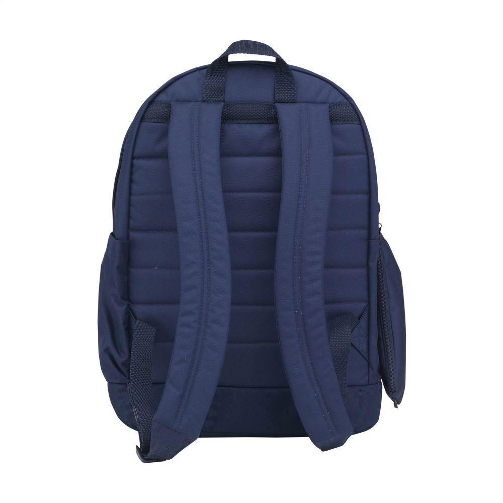 Ontdek deze fraaie rugzak van gerecyclede materialen, perfect als gepersonaliseerd relatiegeschenk met jouw logo. Je laptop tot 15,6 inch past moeiteloos in het flexibele, beschermde vak, terwijl het ruime hoofdvak boeken, documenten en mappen opneemt. Voor kleine elektronica, pennen en accessoires is er een handig voorvak, en het grote zijvak slikt een waterfles zonder morren.
