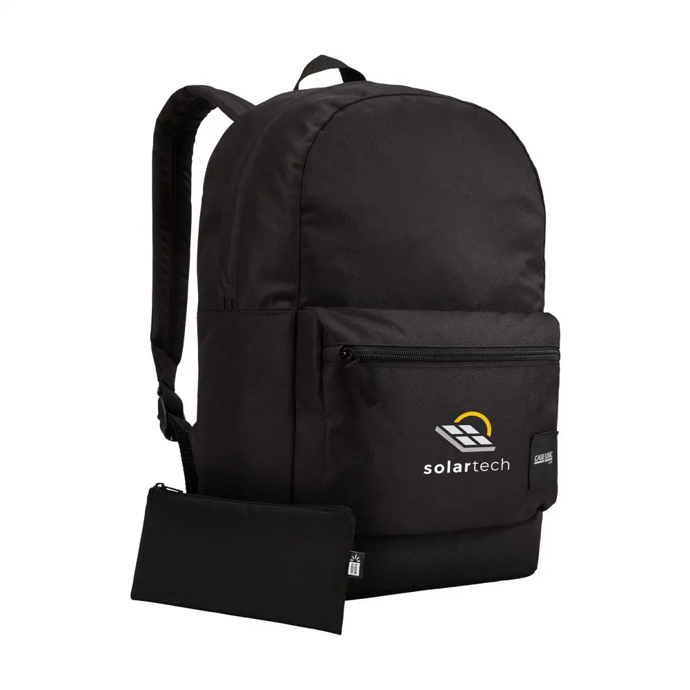 Ontdek de Case Logic Commence Recycled Backpack, een duurzame rugzak van gerecycled polyester, ideaal als gepersonaliseerd relatiegeschenk voor uw onderneming. Met ruimte voor laptops tot 15,6 inch en een tablet, houdt u uw apparatuur veilig en georganiseerd. Het ruime hoofdvak biedt plaats aan documenten, boeken en mappen, terwijl voorvakken en zijvakken kleine accessoires en een waterfles huisvesten.