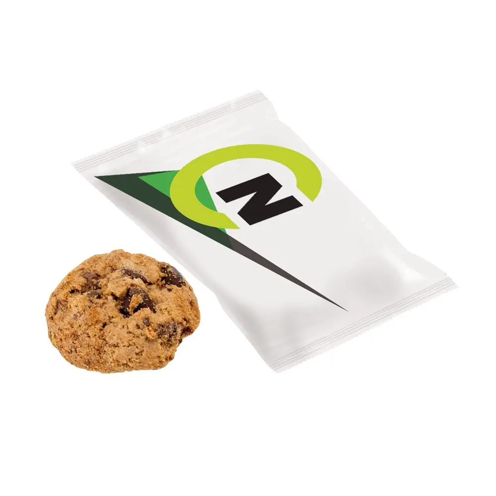 De bedrukking op de folie biedt maximale zichtbaarheid van uw merk, terwijl het compacte formaat het eenvoudig maakt om uit te delen. Klanten genieten van de verse, knapperige textuur met echte chocolate chips, wat zorgt voor positieve associaties met uw bedrijf. Perfect voor grootschalige bestellingen, vergroot dit geschenk de loyaliteit en herkenbaarheid van uw merk.