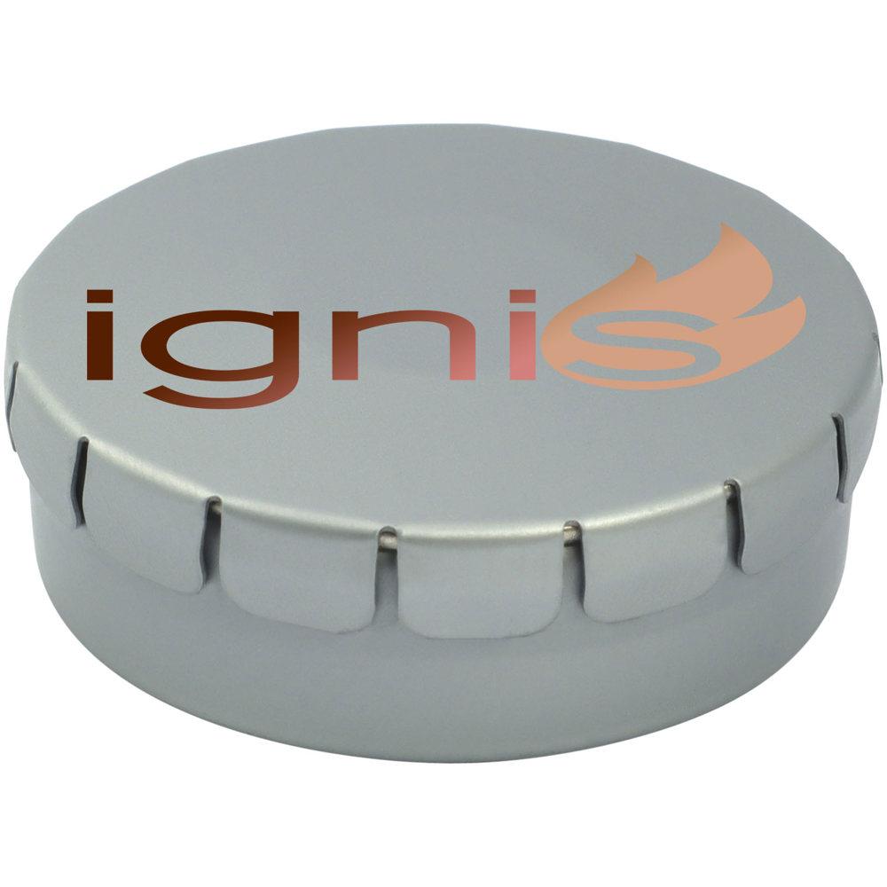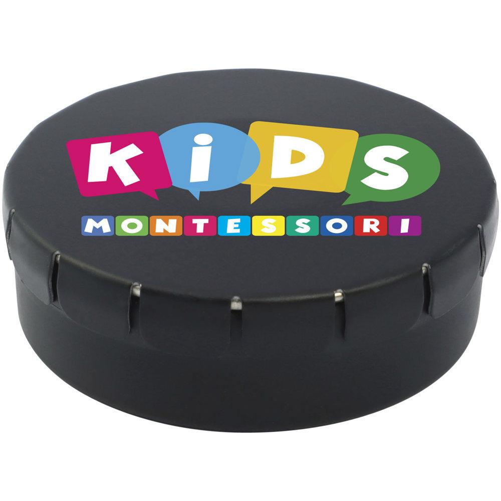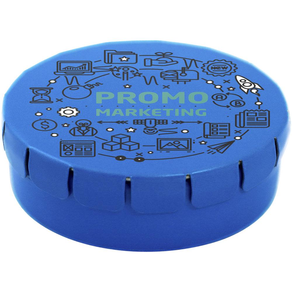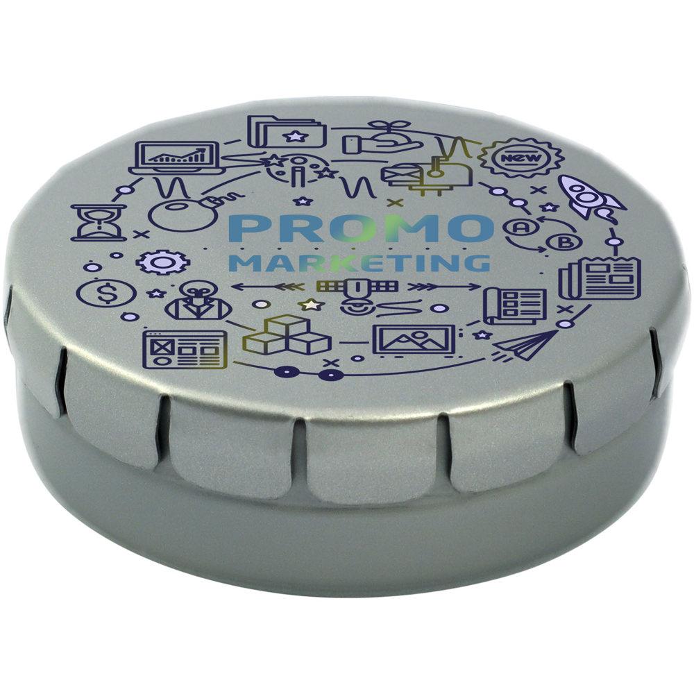 Snoepjes met fruitsmaak in blik met gemakkelijke drukopening. Kan worden besteld in een breed scala van kleuren en gevuld met verschillende vullingen: pepermunt, extra sterke pepermunt, suikervrije pepermunt, fruitsmaak, hartvormige aardbeiensnoepjes, kaneel-, citroen- en pepermuntsmaak, of chocolade. Kan worden gedecoreerd met een full colour digitale print op het deksel.