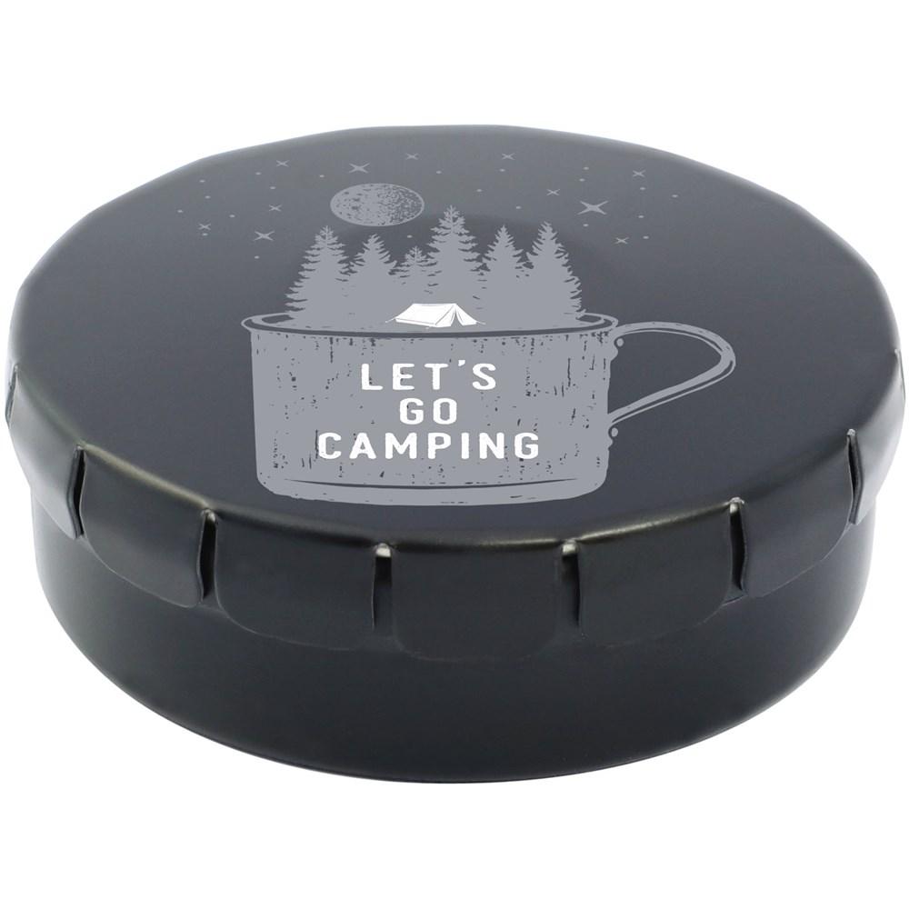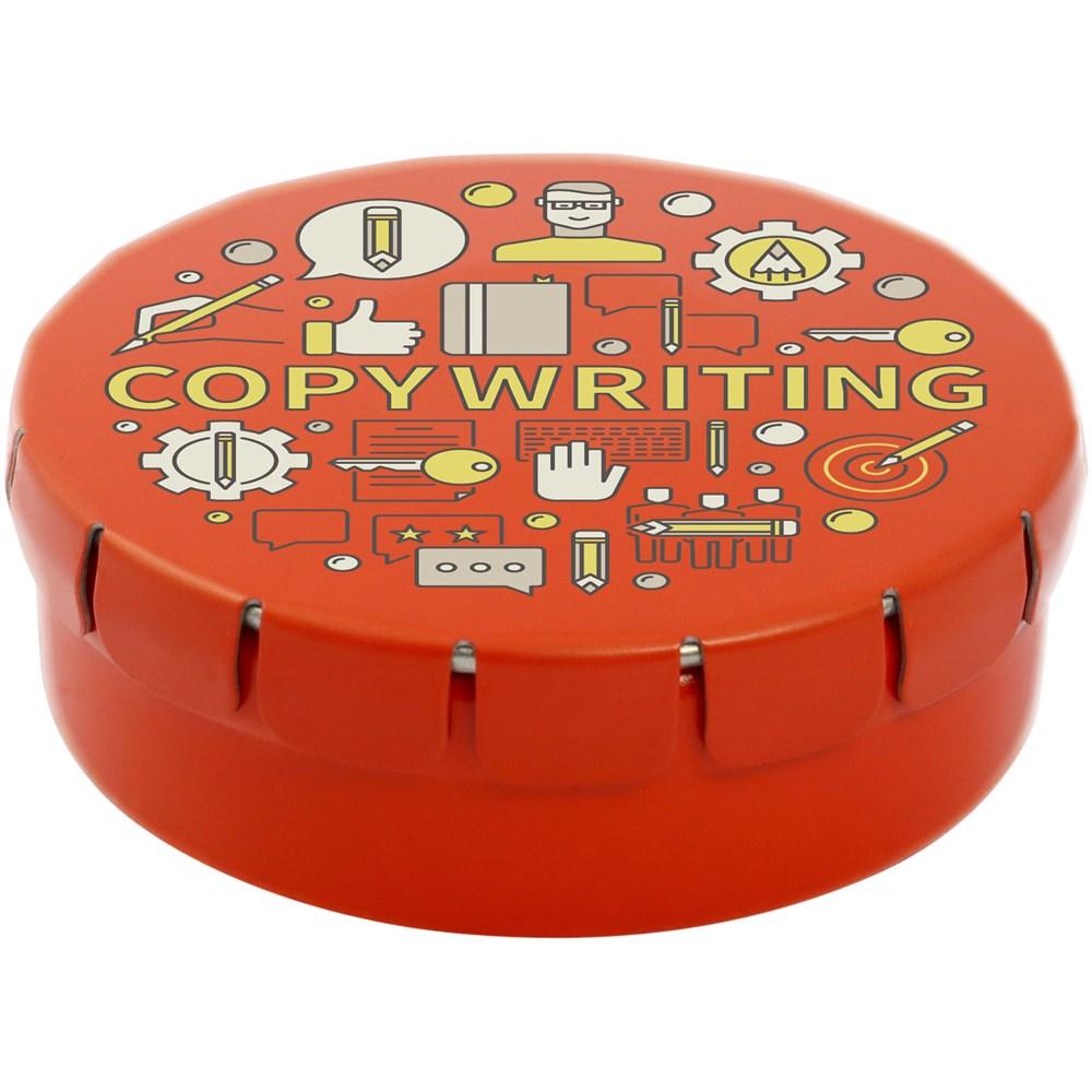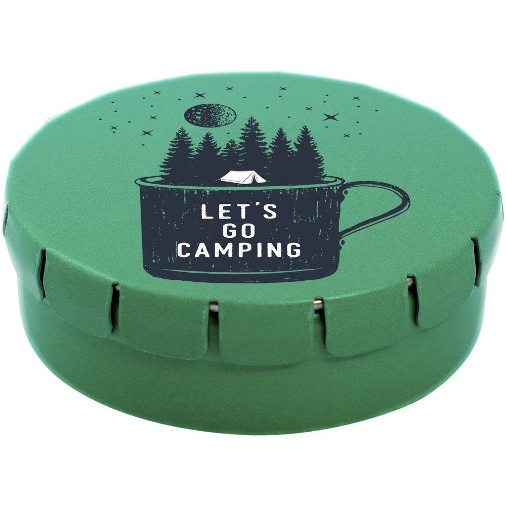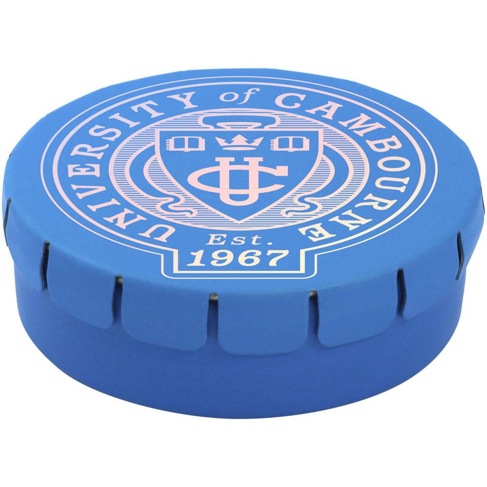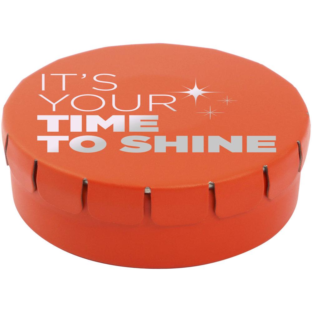 Snoepjes met fruitsmaak in blik met gemakkelijke drukopening. Kan worden besteld in een breed scala van kleuren en gevuld met verschillende vullingen: pepermunt, extra sterke pepermunt, suikervrije pepermunt, fruitsmaak, hartvormige aardbeiensnoepjes, kaneel-, citroen- en pepermuntsmaak, of chocolade. Kan worden gedecoreerd met een full colour digitale print op het deksel.