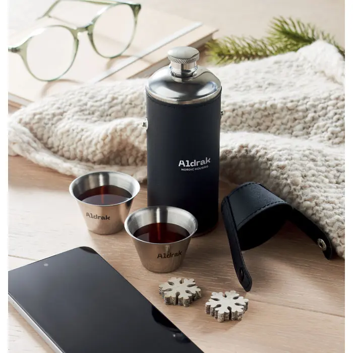 Ontdek onze stijlvolle heupfles met geïntegreerde shot cups, ideaal voor uw marketingacties en events. Deze robuuste heupfles biedt niet alleen praktisch nut, maar versterkt ook uw merkbekendheid door personalisatie met uw logo.