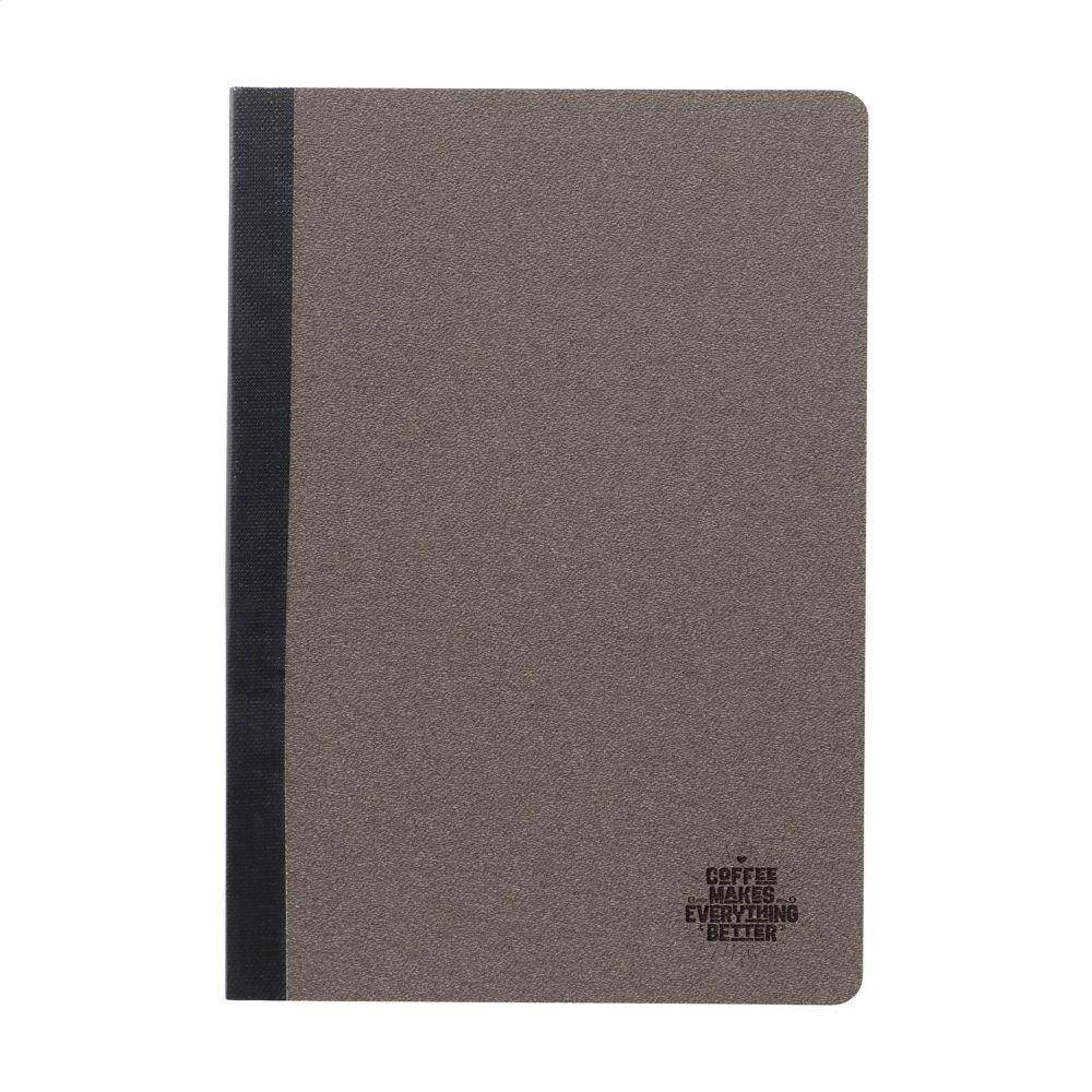 Ontdek het Coffee Notebook A5 notitieboekje met omslag van koffiedik – uniek, duurzaam en zelfs met een subtiele koffielucht. Je kiest voor een product dat koffieresten hergebruikt, volledig biologisch afbreekbaar is en perfect past bij je groene imago als bedrijf.