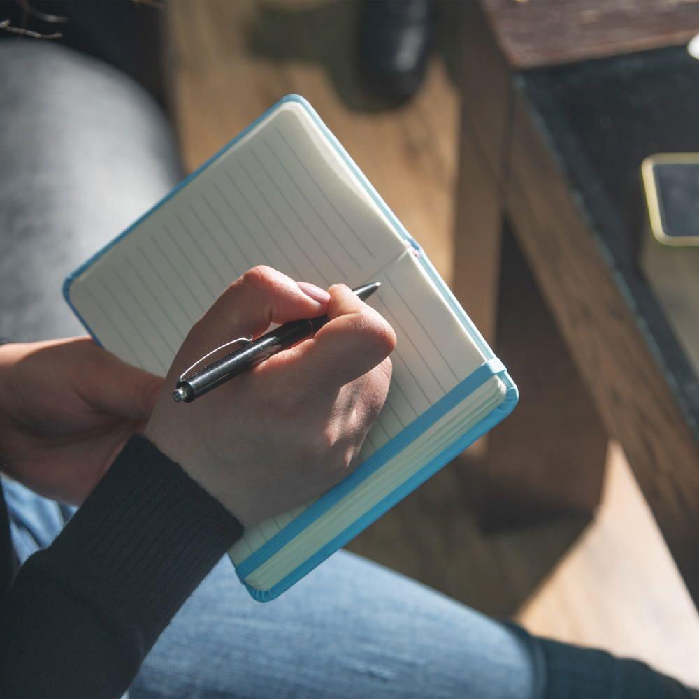 Klassiek ontworpen PU-notitieboek met bijpassende elastische band en lint. 96 vellen wit gelinieerd papier.