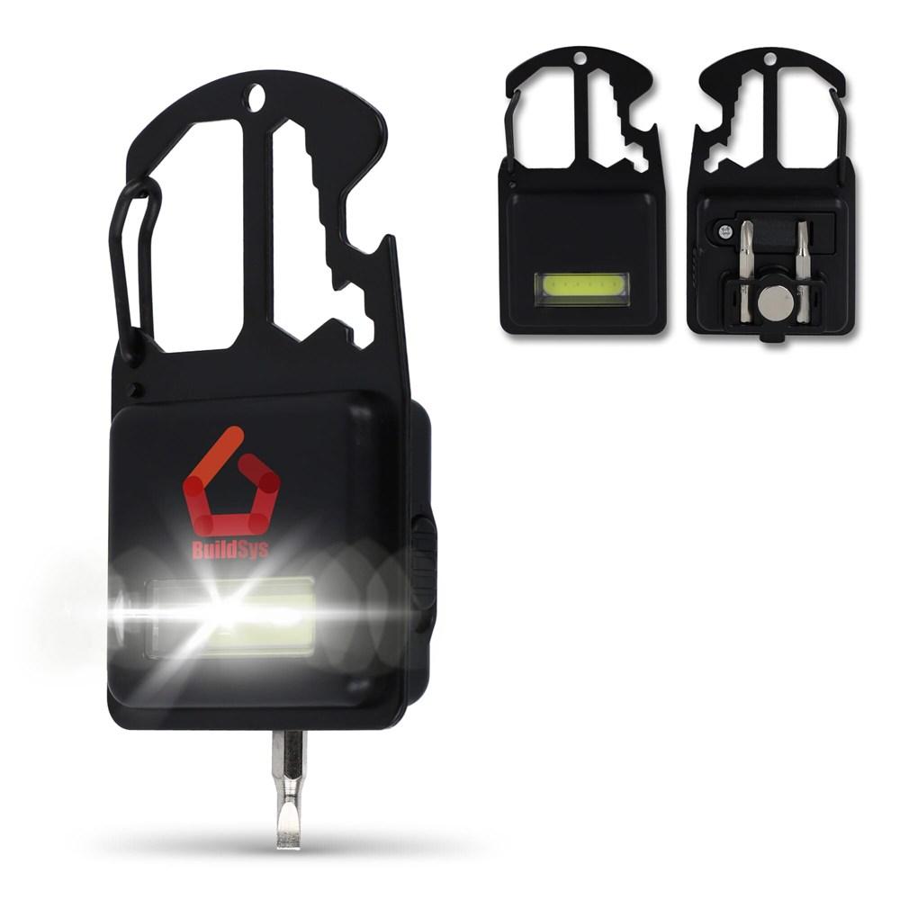 Klem deze handige, multifunctionele tool in zakformaat aan je tas of riemlus, of gebruik de magneet om hem aan elk stalen oppervlak te bevestigen voor handsfree gebruik van de lamp. Deze tool heeft vijf extra functies: flesopener, moersleutel, COB-lamp, sterpuntschroevendraaier en platte schroevendraaier.