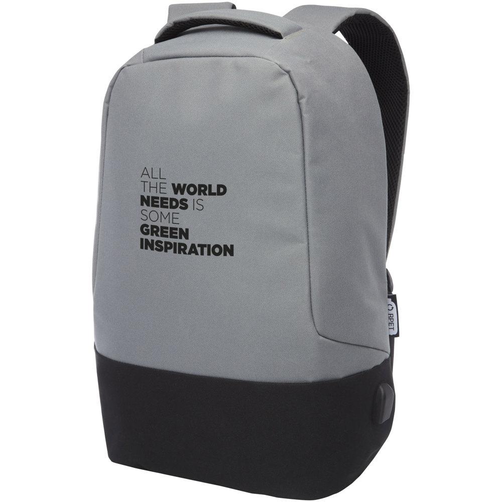 GRS gecertificeerd rugzak voorzien van een open hoofdvak met opbergpanel, gevoerde 15" laptophoes en 2 RFID beschermvakken. USB poort aan de rechterkant om eenvoudig apparaten van binnenuit aan te sluiten en op te laden. Wordt geleverd met gevoerde schouderbanden, rechterschouderband, verborgen ritsvak, handgreep en een trolleydoorvoer. Er worden ongeveer 15 plastic flessen gerecycled om deze tas te maken.