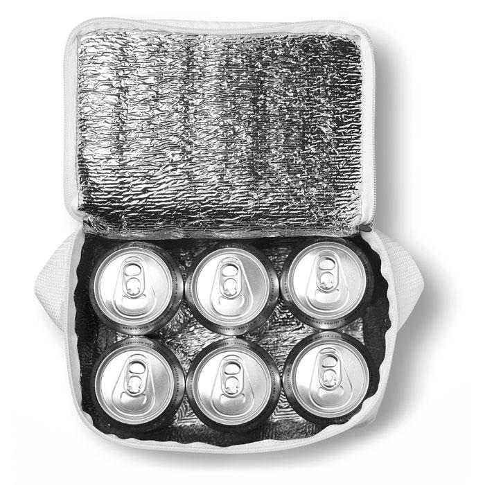 Koeltas voor 6 standaard blikjes met een aluminiumfolie beklede binnenkant. 80 g/m2. Isolatie materiaal: Schuim laminaat met aluminiumfolie. Capaciteit 3L.