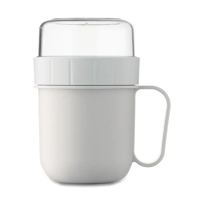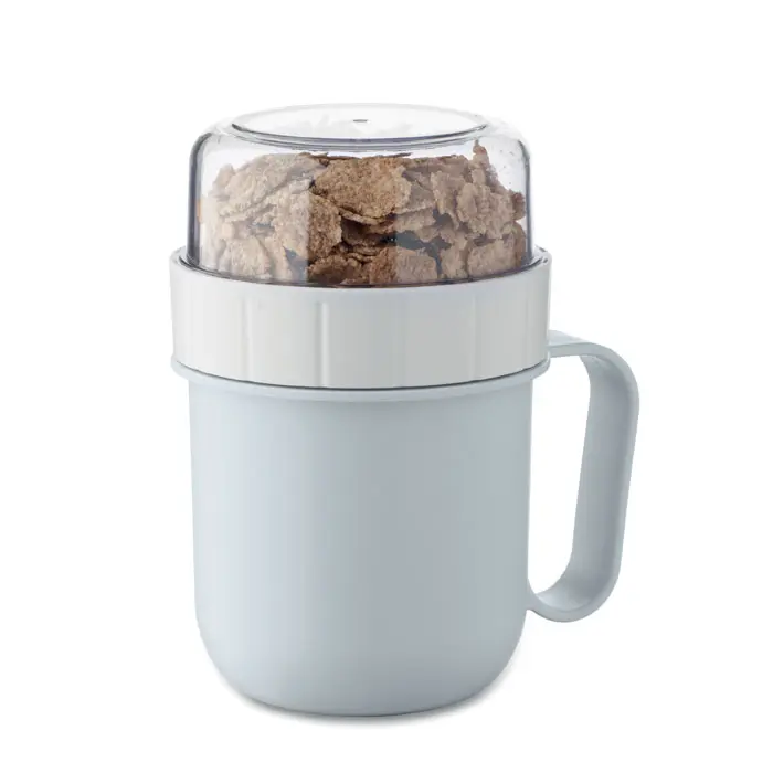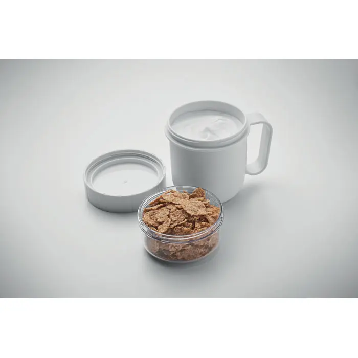 Ontdek de CUP ON GO - Meeneembeker van 450 ml, ideaal voor uw ontbijt of brunch onderweg. Deze praktische beker uit PP-materiaal met PS-deksel bevat twee aparte compartimenten (450 ml en 160 ml), zodat u ingrediënten zoals granola en yoghurt gescheiden kunt houden. Dankzij de lekvrije afsluiting blijft alles vers en netjes tijdens transport.