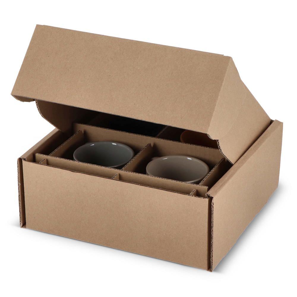 Deze stevige kartonnen verpakking bevat een raster voor een perfecte positionering van de mokken, zodat ze veilig blijven tijdens transport en uitreiking.