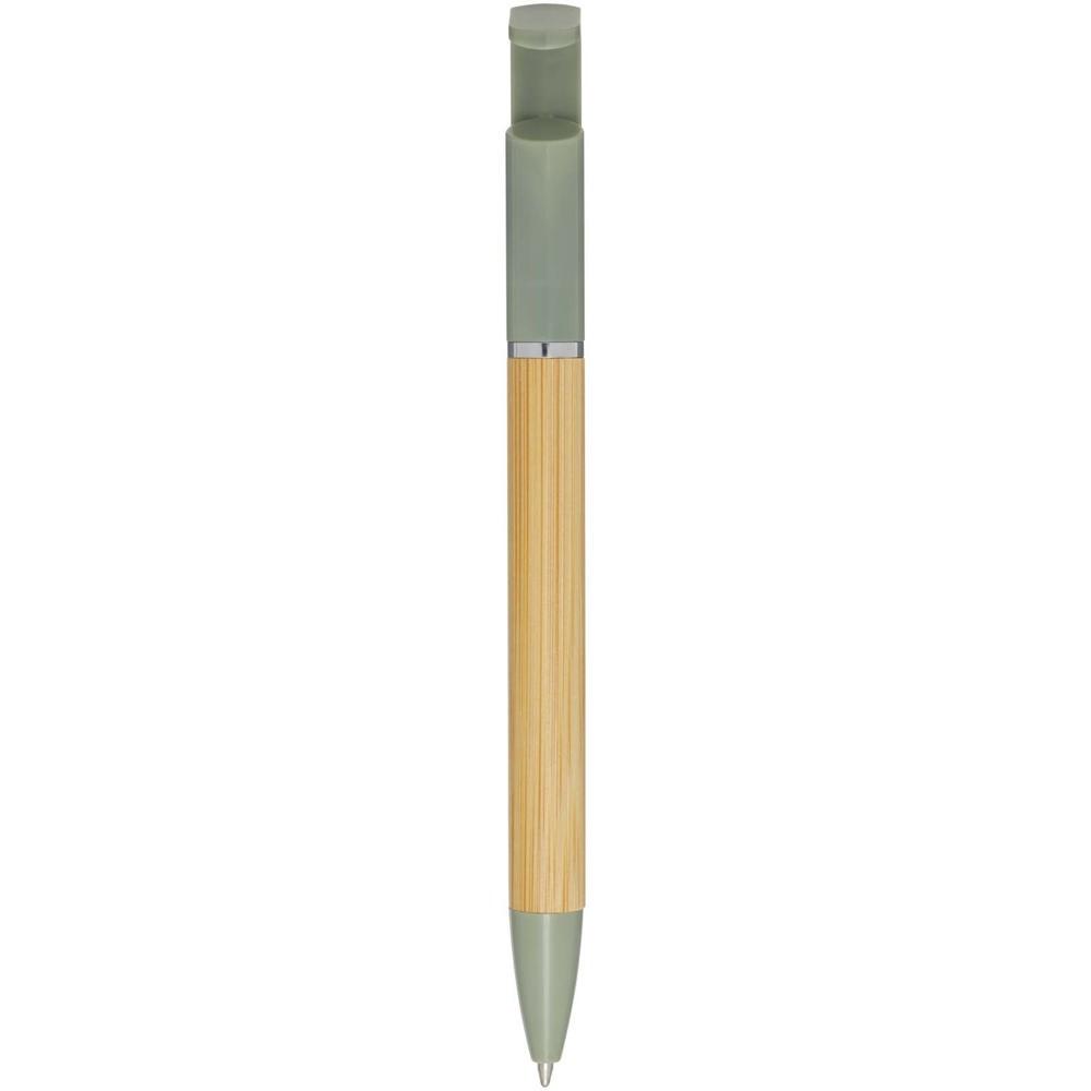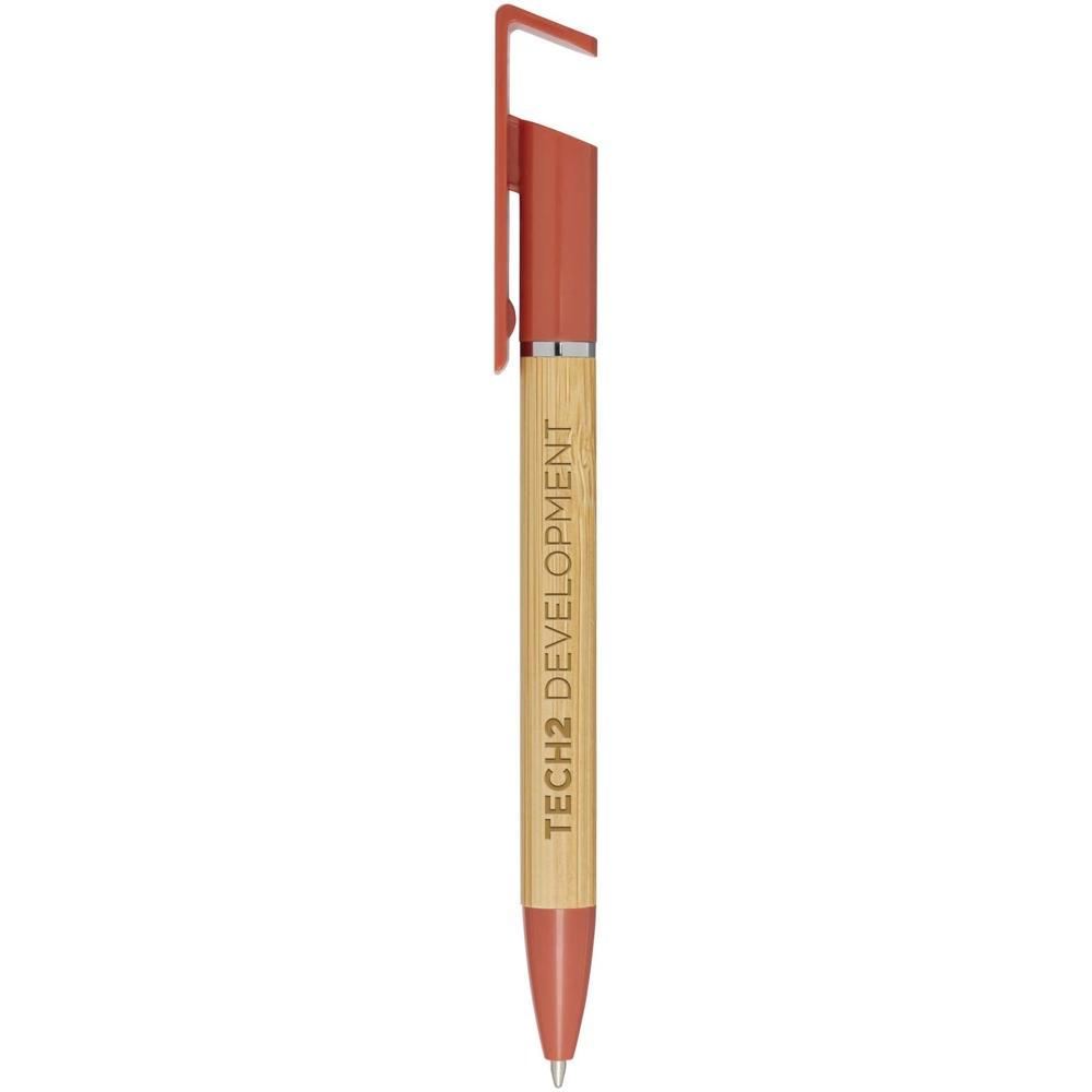 Bamboe balpen die ook dienst doet als telefoonhouder. De knop en middenring zijn gemaakt van gerecycled plastic, de punt is gemaakt van messing en de houder is gemaakt van verantwoord gewonnen bamboe. Inktkleur: zwart. Schrijflengte: 1000 meter. Stiftmaat: 1,0 mm.