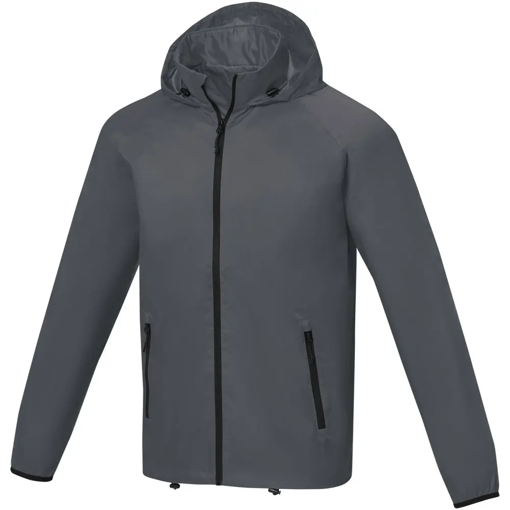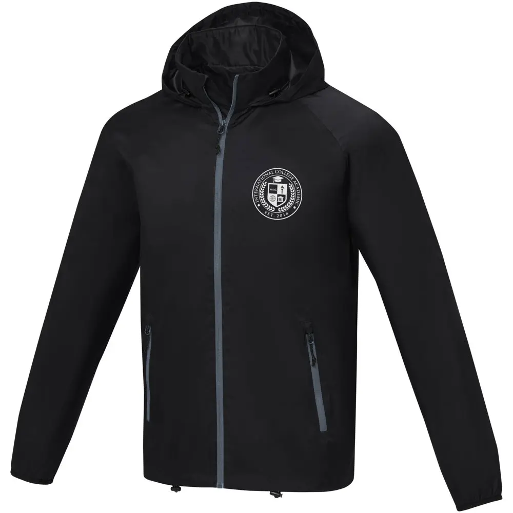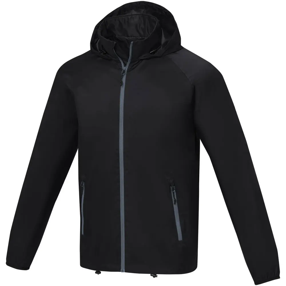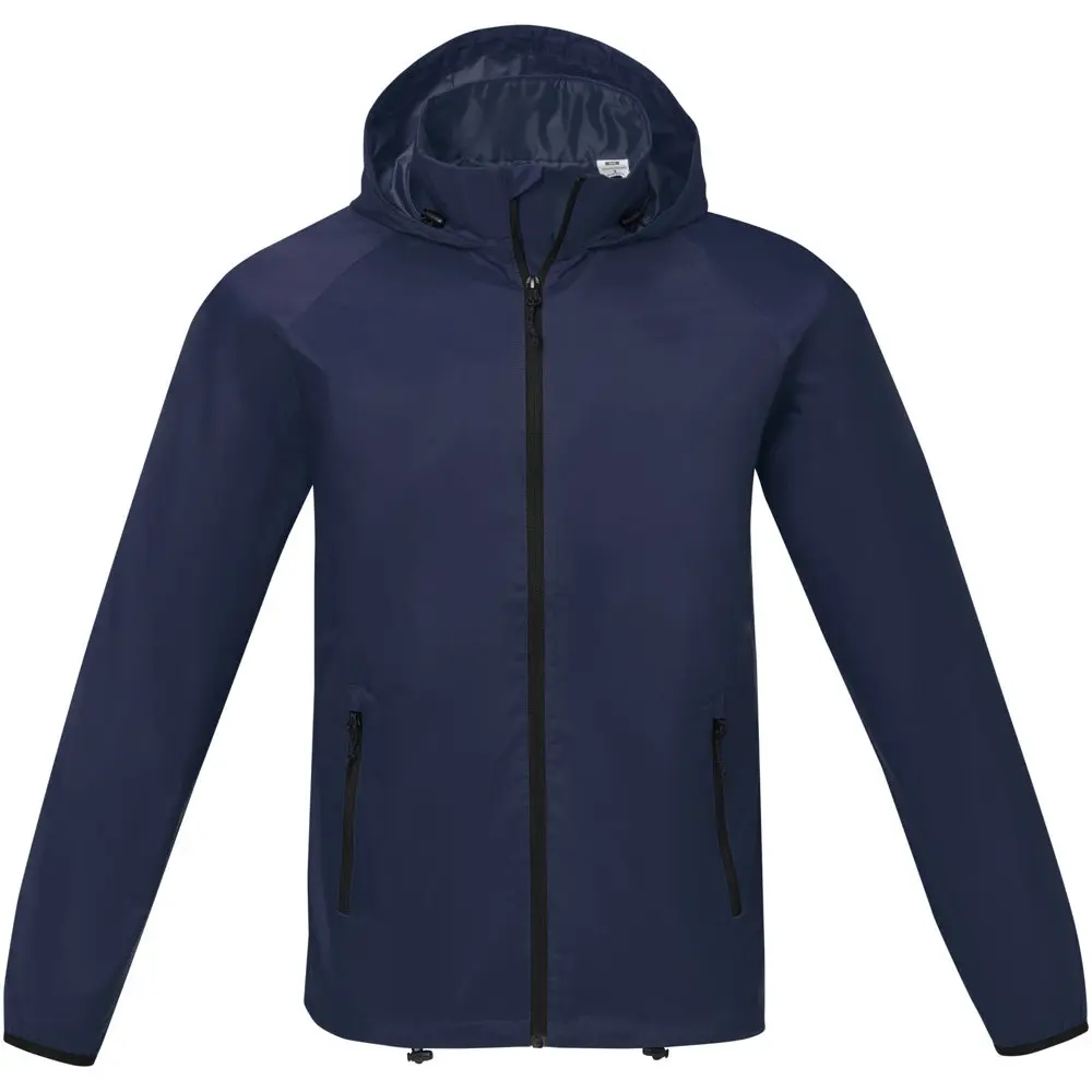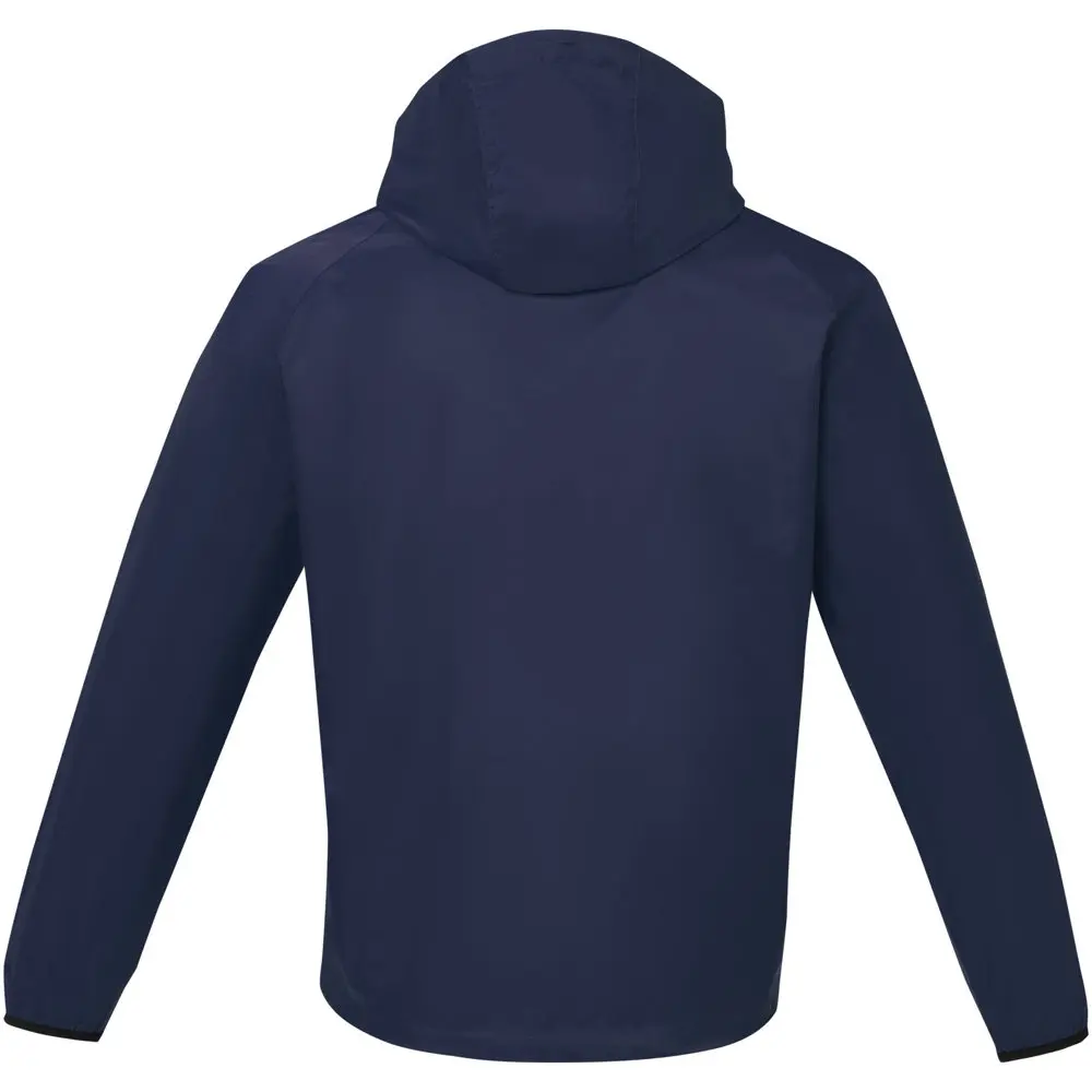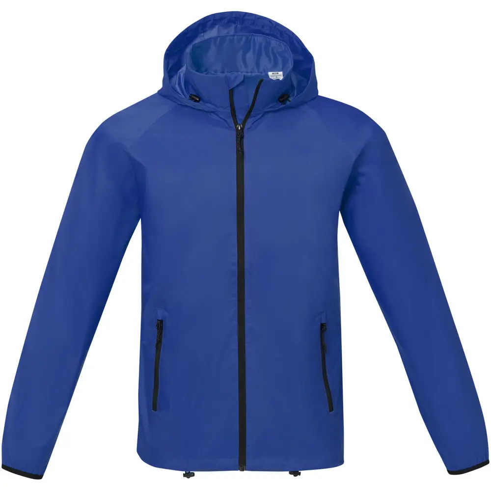 Ontdek de Dinlas lichtgewicht herenjas, perfect als gepersonaliseerd relatiegeschenk voor uw bedrijf. Gemaakt van 280T ripstop nylon (72 g/m²) met een 210T taffeta polyester voering (60 g/m²), biedt deze jas optimale bescherming tegen lichte regen dankzij de waterafstotende coating van 500 mm. De afrolbare capuchon en raglanmouwen zorgen voor veelzijdigheid en bewegingsvrijheid, ideaal voor actieve outdooractiviteiten op events of promoties.