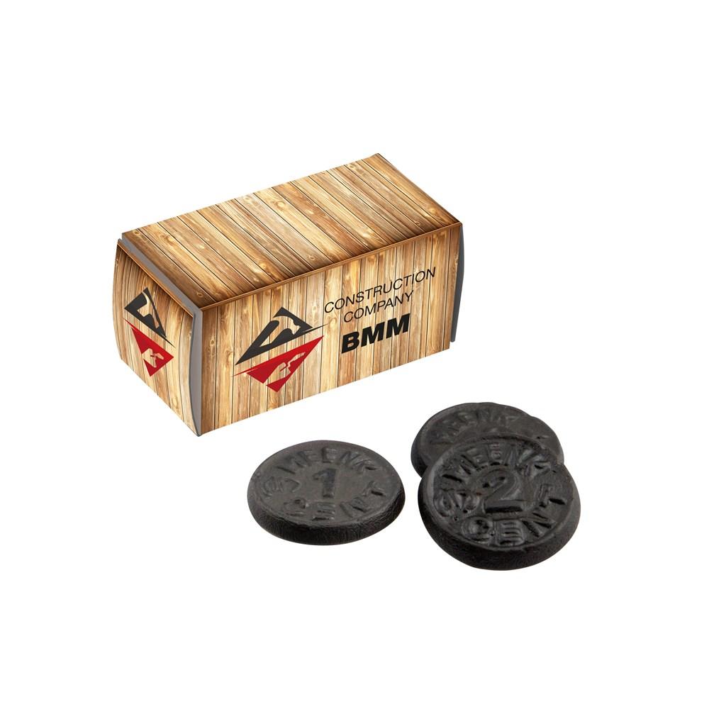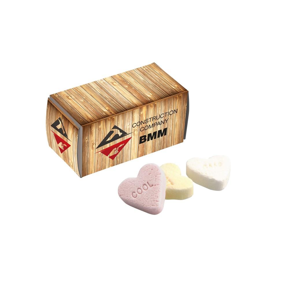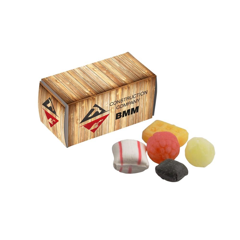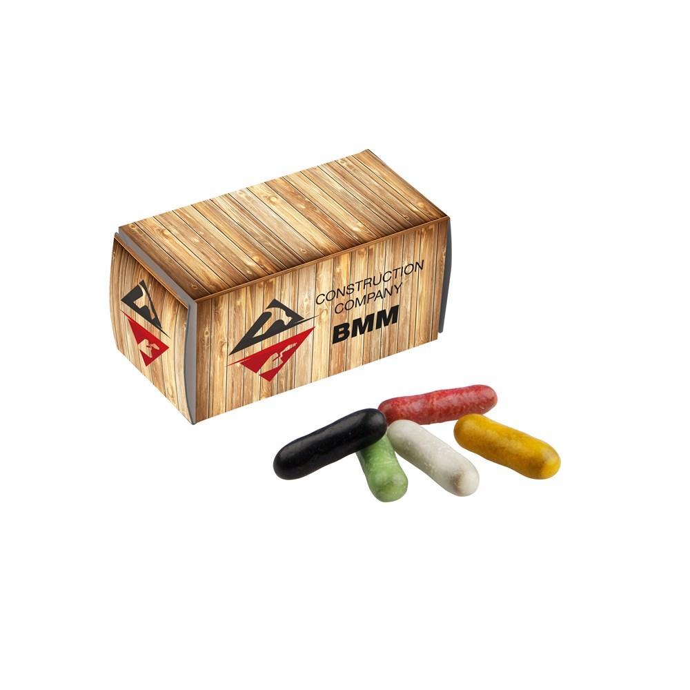 Full colour bedrukt doosje, opgemaakt als container en gevuld met ca. 40 gram Dropstaafjes mix