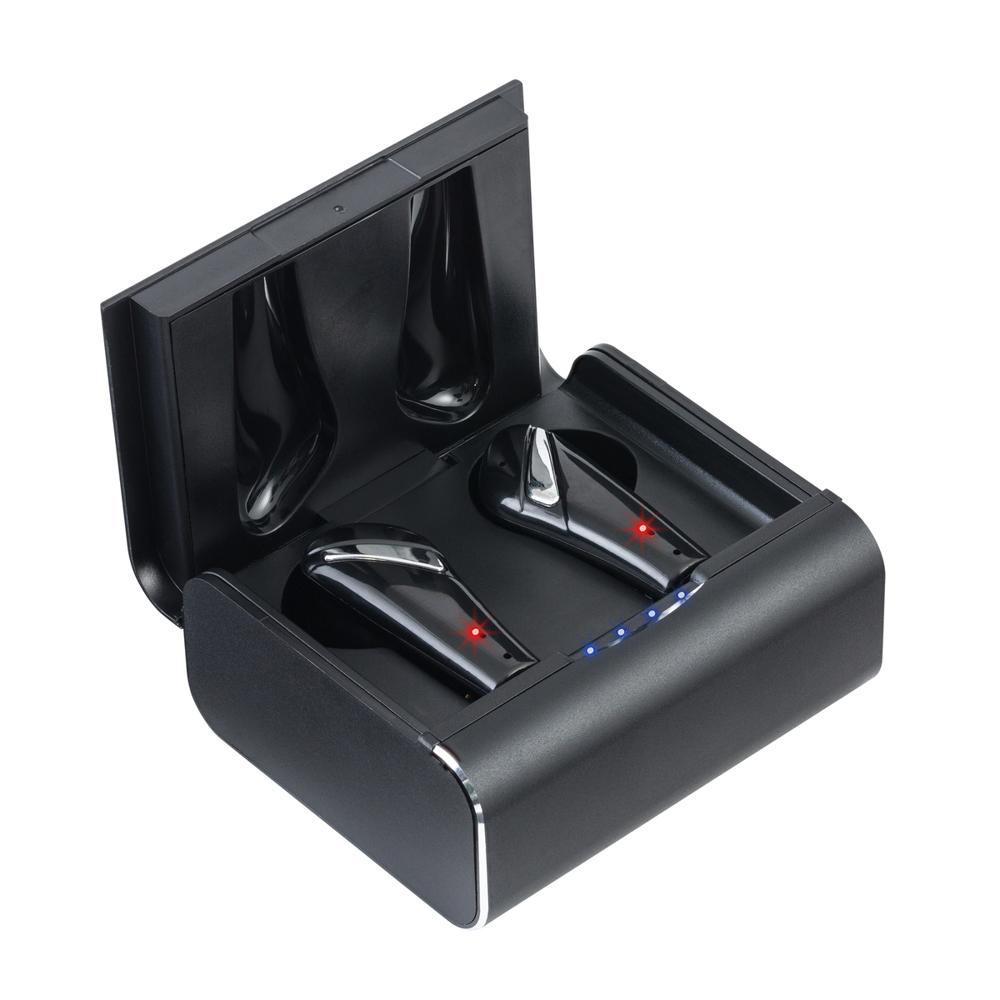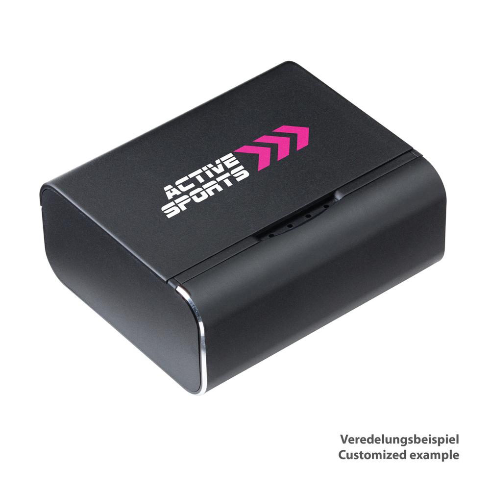 De zwarte in-ear hoofdtelefoon heeft een stijlvolle, magnetische oplaadbox van kunststof en aluminium. De microfoon van de hoofdtelefoon is met Environmental Noise Cancellation uitgerust. Hiermee is een kristalheldere spraakoverdracht zonder ruis mogelijk. De hoofdtelefoon ondersteunt Wireless 5.0, kan afzonderlijk worden gebruikt en heeft een bereik van maximaal 10m tot het gekoppelde apparaat. De hoofdtelefoon heeft een speelduur van ongeveer 5 uur en kan tot drie keer met een volledig opgeladen box worden opgeladen (LED-oplaadindicator in de box).