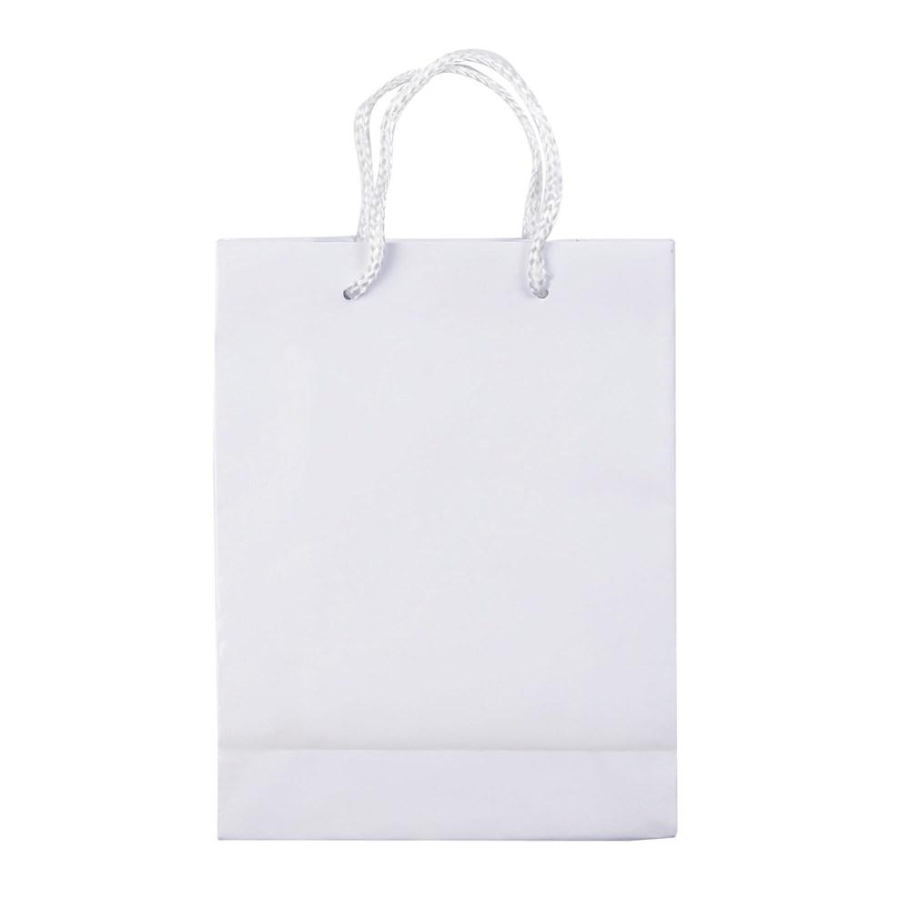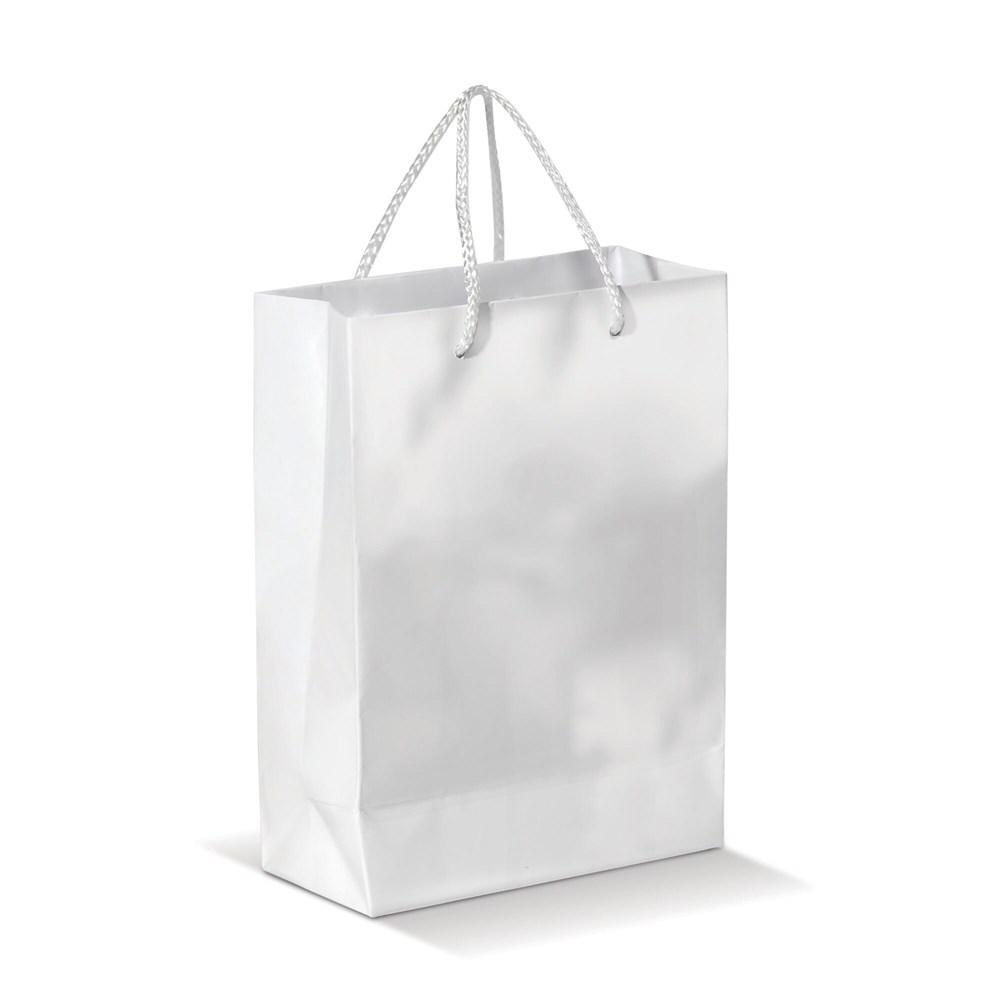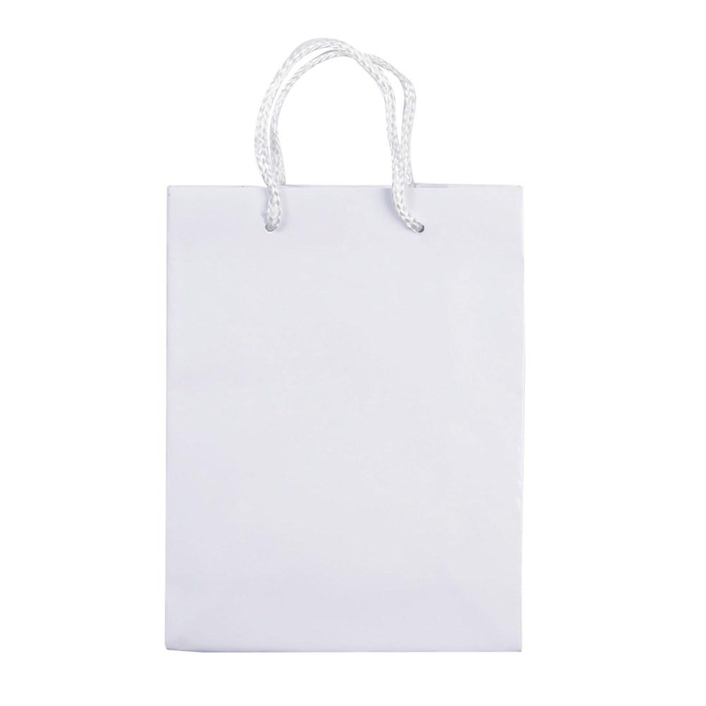Kleine papieren tas met hengels van gevlochten touw in wit en zwart. Stevig en geschikt voor kleine artikelen. Glossy gelamineerd.