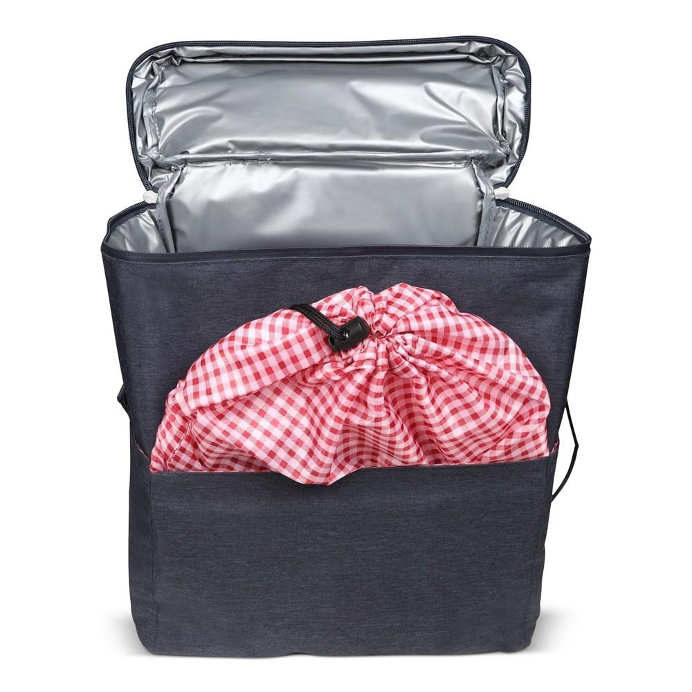 Dubbele fietstas gemaakt van R-PET met gemêleerd effect. Een vak van de tas is geïsoleerd en houdt eten en drinken koel onderweg naar een picknick. Het andere vak biedt plaats aan een meegeleverde set borden en bestek voor 4 personen (bord, glas, vork/mes/lepel). De gladde geruite voering is makkelijk schoon te houden en geeft een verrassend effect aan deze moderne fietstas. Aan één zijde is een speciaal vak voor een fles wijn geplaatst. De fietshaken zijn universeel en passen op de meeste fietsen inclusief e-bikes.