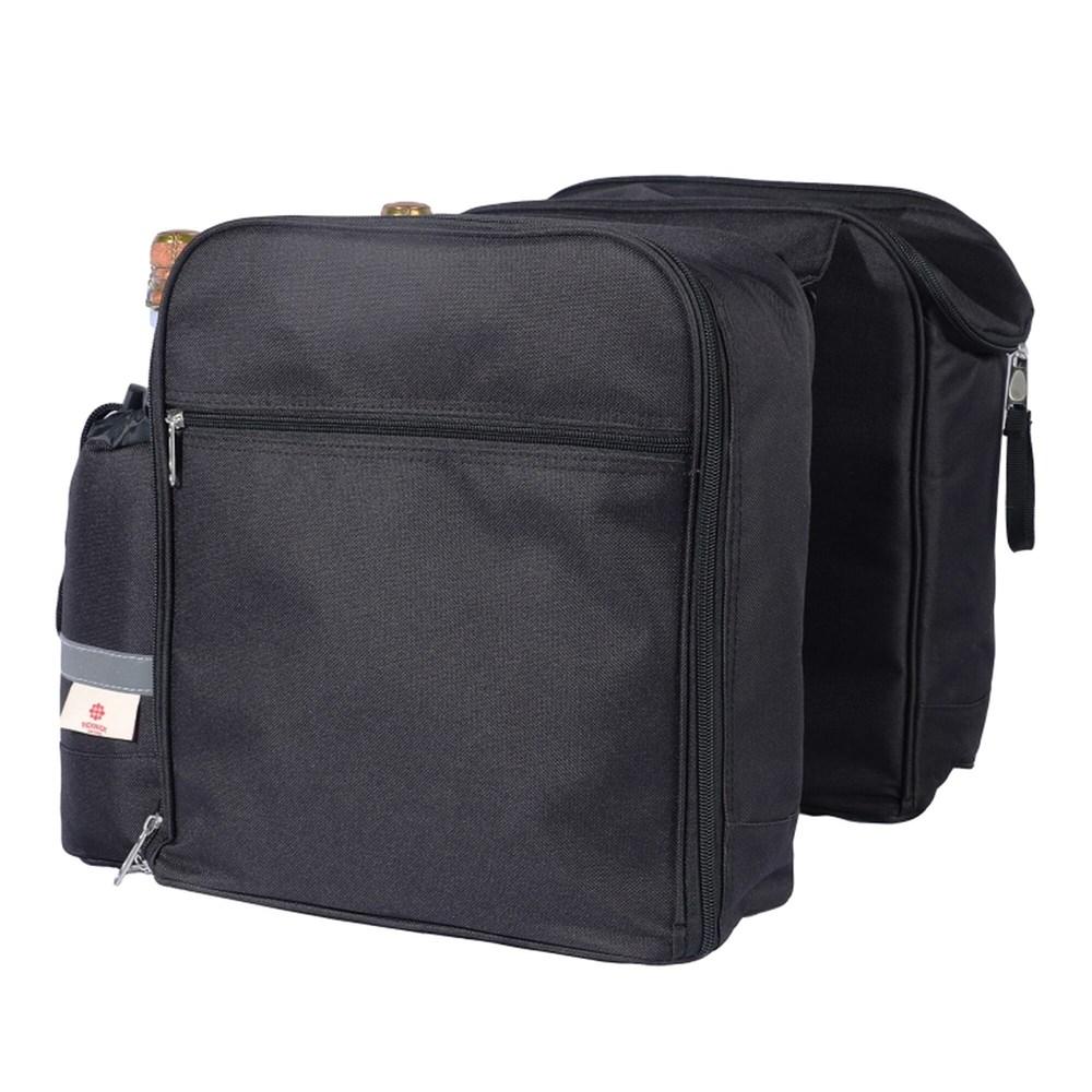 Ruime dubbele picknick fietstas met een uitgebreide set bestek, kopjes, bordjes, snijplank en kurkentrekker voor vier personen aan één kant. De andere kant van de fietstas is een zeer ruim koelvak voorzien van isolatiemateriaal. De geïsoleerde flessenhouders zijn van reflecterend materiaal voorzien voor extra veiligheid in het donker. Door de universele fietshaken is deze tas op veel verschillende modellen (ook e-bikes) te monteren.