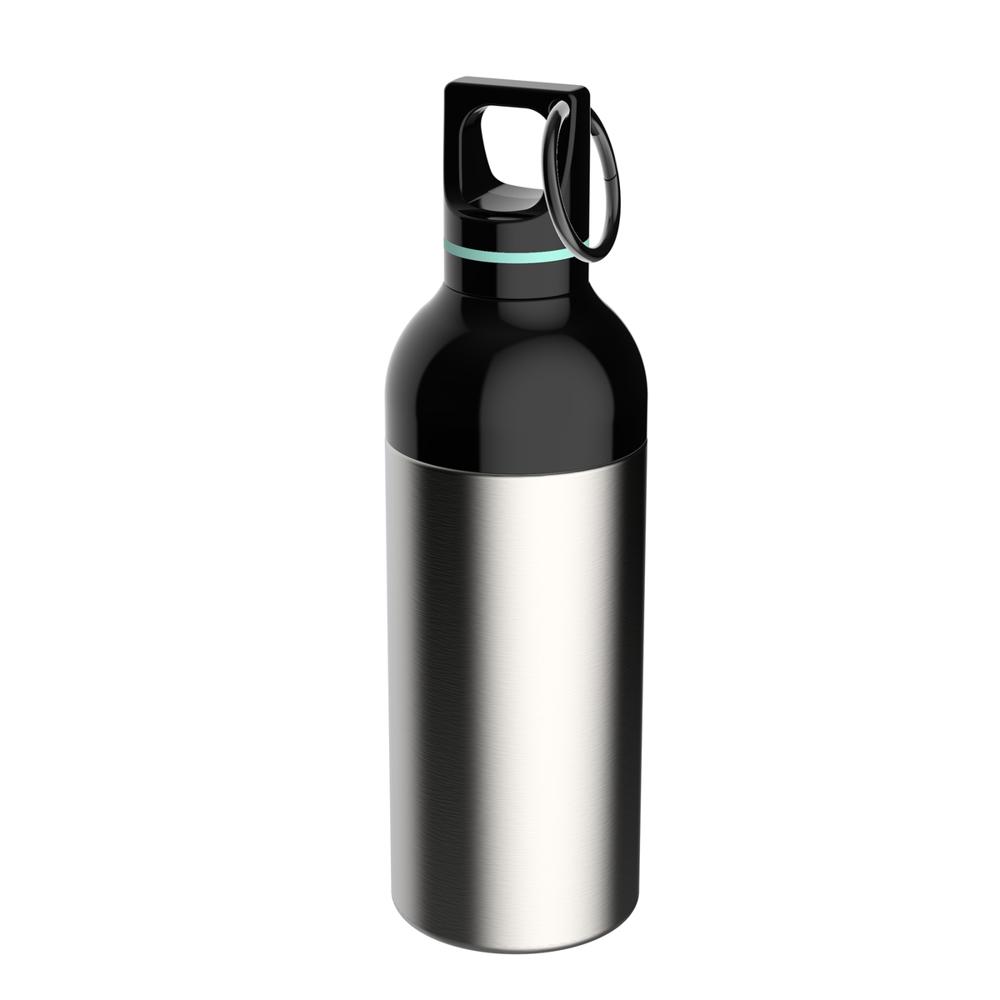 Gemaakt van gerecycled roestvrij staal met micro poedercoating voor een premium feel en duurzaamheid. De karabijnhaak maakt hem makkelijk mee te nemen aan een rugzak of riem.