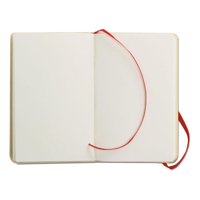 A6 notitieboek met harde kaft van gerecycled papier. Ingebonden. 192 pagina’s van blanco gerecycled papier (96 vellen). Elastische sluitingsband en bladwijzer met lint. FSC®-certified | FSC MIX CREDIT, P7.1, FSC-C213206
