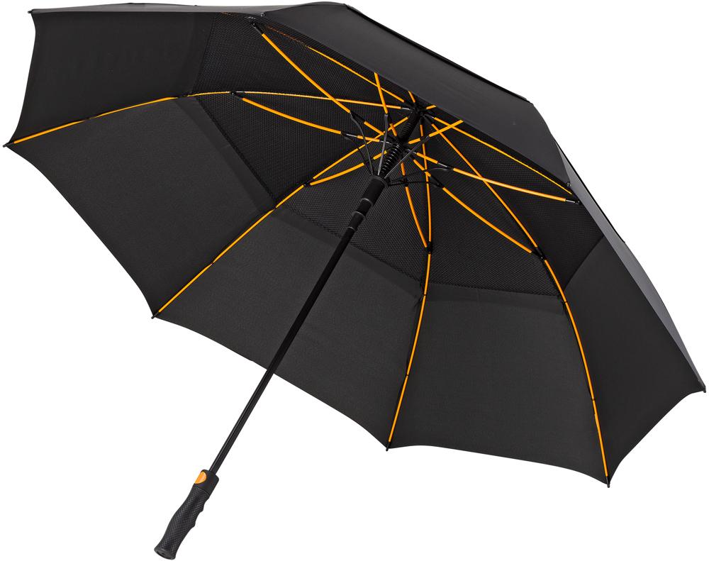 GP-76 FALCONE hoge kwaliteit windproof golfparaplu, automaat. Hoogwaardig oranje glasfiber frame. 210T polyester pongee doek met overlappende panelen om de wind door te laten. Zwart rubber finished handvat, met een opening aan de onderkant om uw eigen doming toe te voegen en met een foedraal.- Handvat: Recht- Fiberglas: Frame en stok- Canopy materiaal: Polyester pongee 210T- Case: Ja- Doming: Ja- Type paraplu: Stormparaplu- Paneel afmeting A-B-C (cm): 68 x 50 x 76- Aantal panelen: 8- Diameter (cm): 130- Verpakking in polybag: Ja- Windproof: Ja