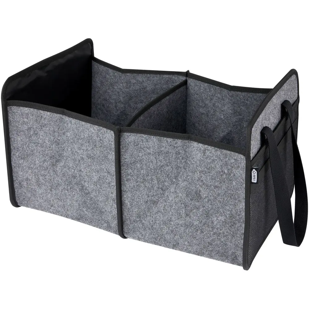 De Felta opvouwbare auto-organizer van gerecycled vilt biedt u een praktische en duurzame oplossing voor het organiseren van uw kofferbak. Gemaakt van hoogwaardig GRS-gecertificeerd gerecycled polyester, met twee grote vakken voorzien van versterkte bodemplaten, een voorvak, een meshvak en stevige geweven katoenen handgrepen van 30 x 2,5 cm, houdt u alles netjes gesorteerd.