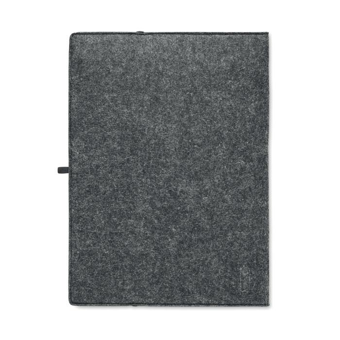 A4 conference folder in RPET felt. 100 lined recycled paper sheets notepad with elastic pen holder. Heeft verschillende vakken.
