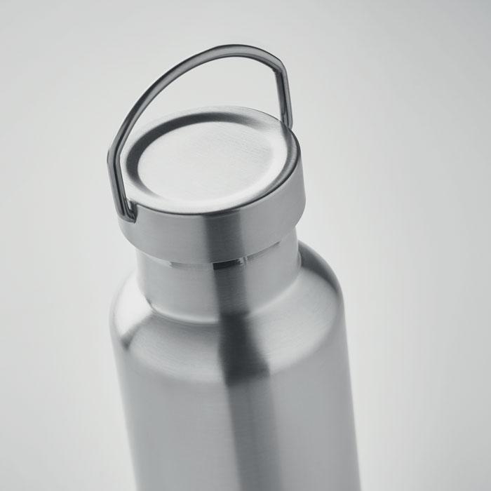 Dubbelwandige isolerende vacuümfles van gerecycled roestvrij staal (90% gerecycled RVS en 10% RVS) en dop voorzien van handvat. Inhoud: 500 ml.