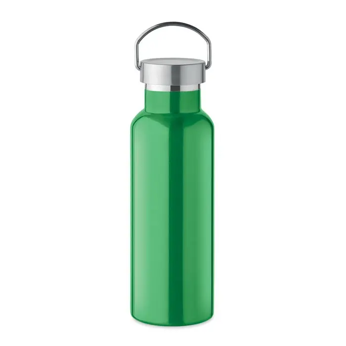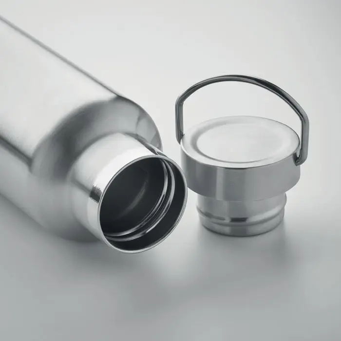 Ontdek onze dubbelwandige fles met een capaciteit van 500 ml, vervaardigd uit 90% gerecycled roestvrij staal en 10% roestvrij staal. De vacuümisolatie zorgt ervoor dat uw drankjes urenlang warm of koud blijven, ideaal voor actieve professionals en events. De dop met handvat biedt extra gebruiksgemak tijdens onderweg.