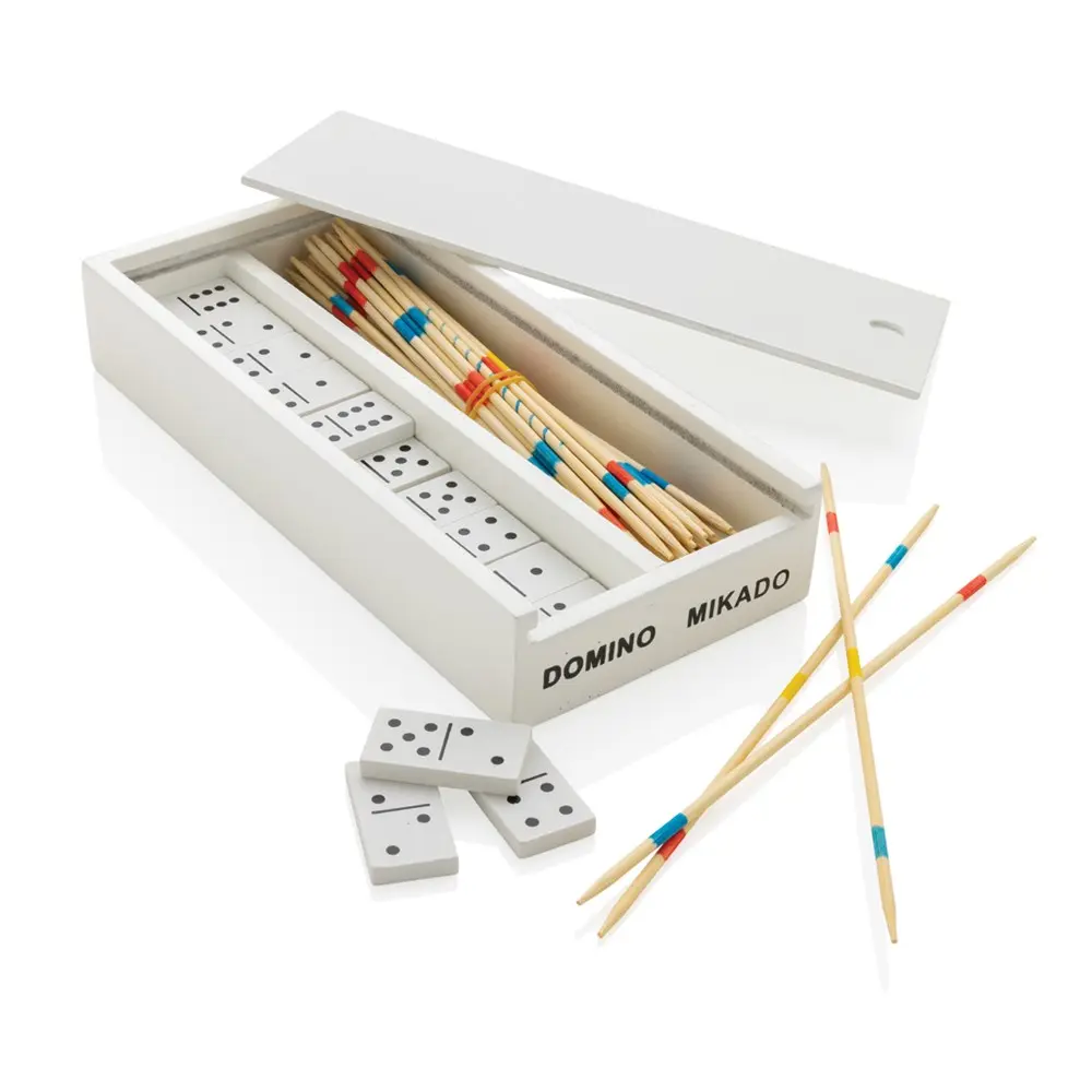 Creëer onvergetelijke en gezellige momenten met deze deluxe set klassieke spellen, ideaal als gepersonaliseerd relatiegeschenk. De set bevat een mikado met 41 stokjes en een domino met 28 blokjes, netjes opgeborgen in een stevige houten kist. Gemaakt van hoogwaardig MDF-materiaal, biedt deze set niet alleen entertainment, maar ook een duurzame en professionele uitstraling voor uw merk.