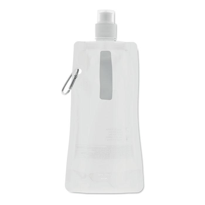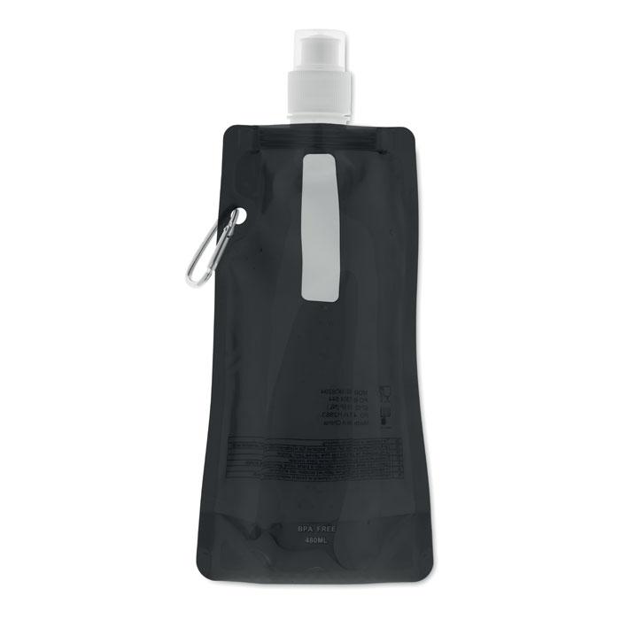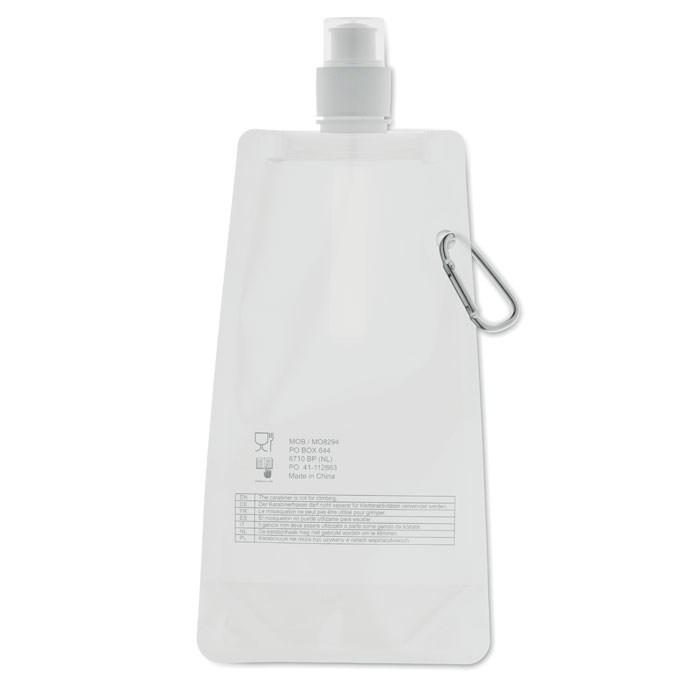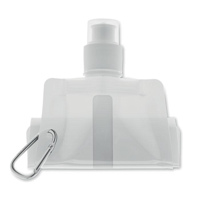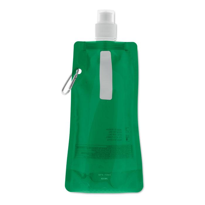 Opvouwbare PET drinkfles van BPA vrij kunststof met aluminium karabijnhaak. Inhoud 480 ml. Lekvrij.