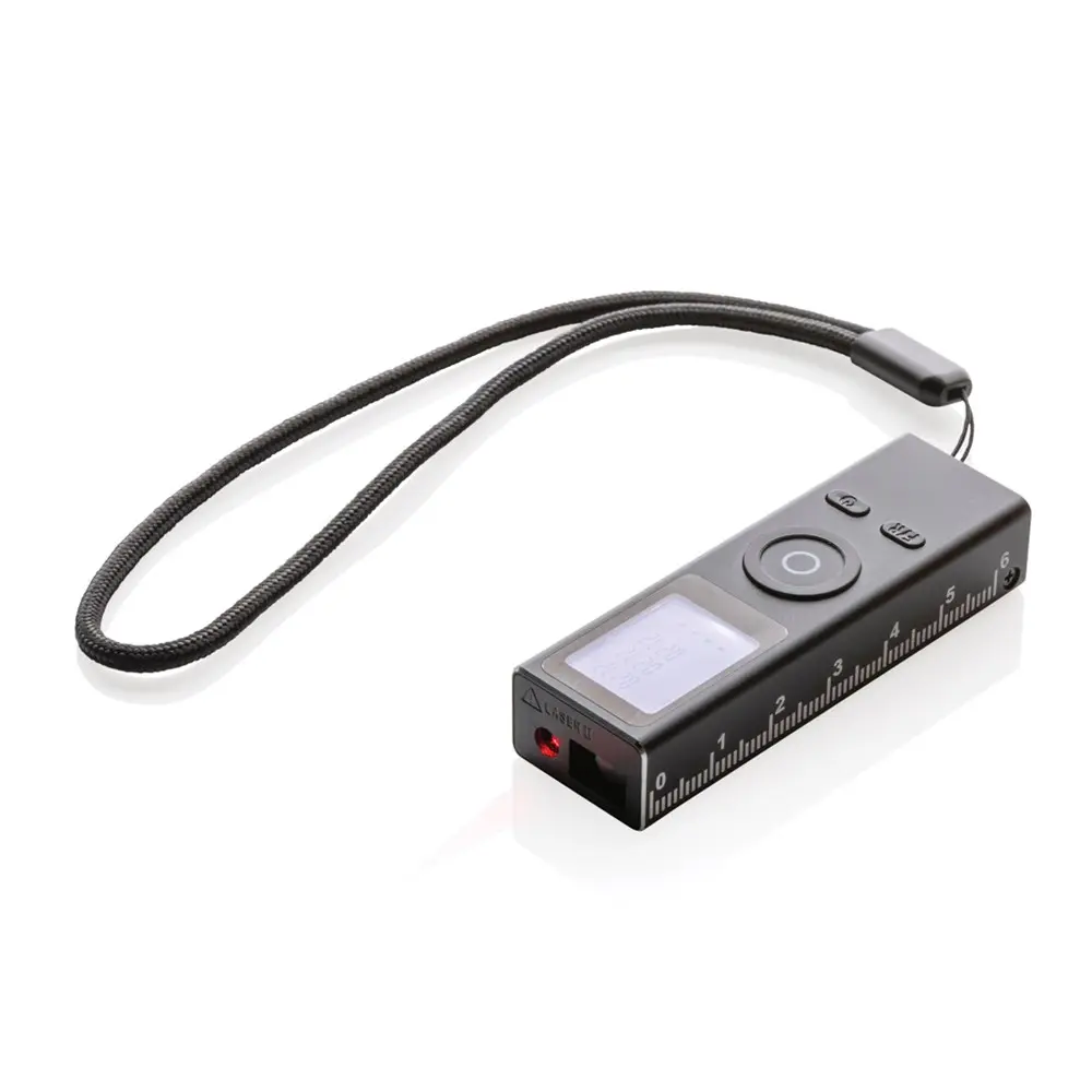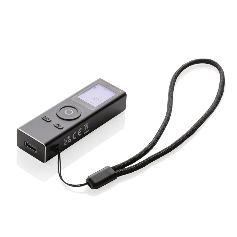 Ontdek deze geavanceerde oplaadbare laserafstandsmeter met een bereik van 30 meter, ideaal voor uw marketingacties en events. Gemaakt van RCS-gecertificeerd gerecycled aluminiumlegering met een totale gerecyclede inhoud van 22%, voldoet het product aan strenge ecologische normen en een gecertificeerde toeleveringsketen. U ontvangt een duurzaam en professioneel relatiegeschenk dat perfect past bij uw bedrijfsimago.