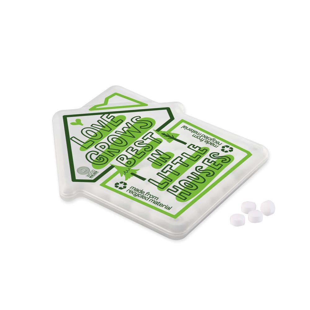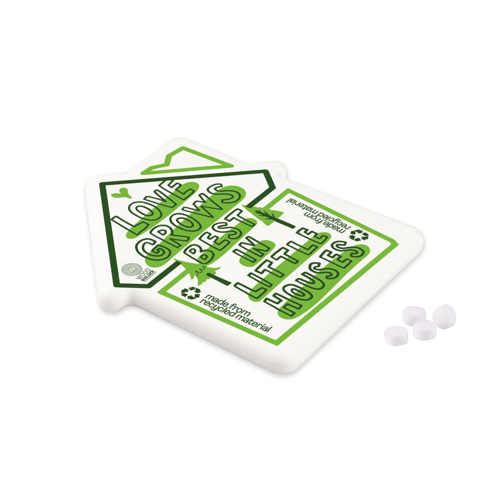 Ontdek onze gerecyclede mint dispenser in de vorm van een huisje, perfect als gepersonaliseerd relatiegeschenk voor jouw events en promoties. Je ontvangt een handig dispensertje gevuld met ongeveer 8 gram suikervrije pepermuntjes zonder Aspartaam, ideaal om uit te delen aan klanten en prospects.
