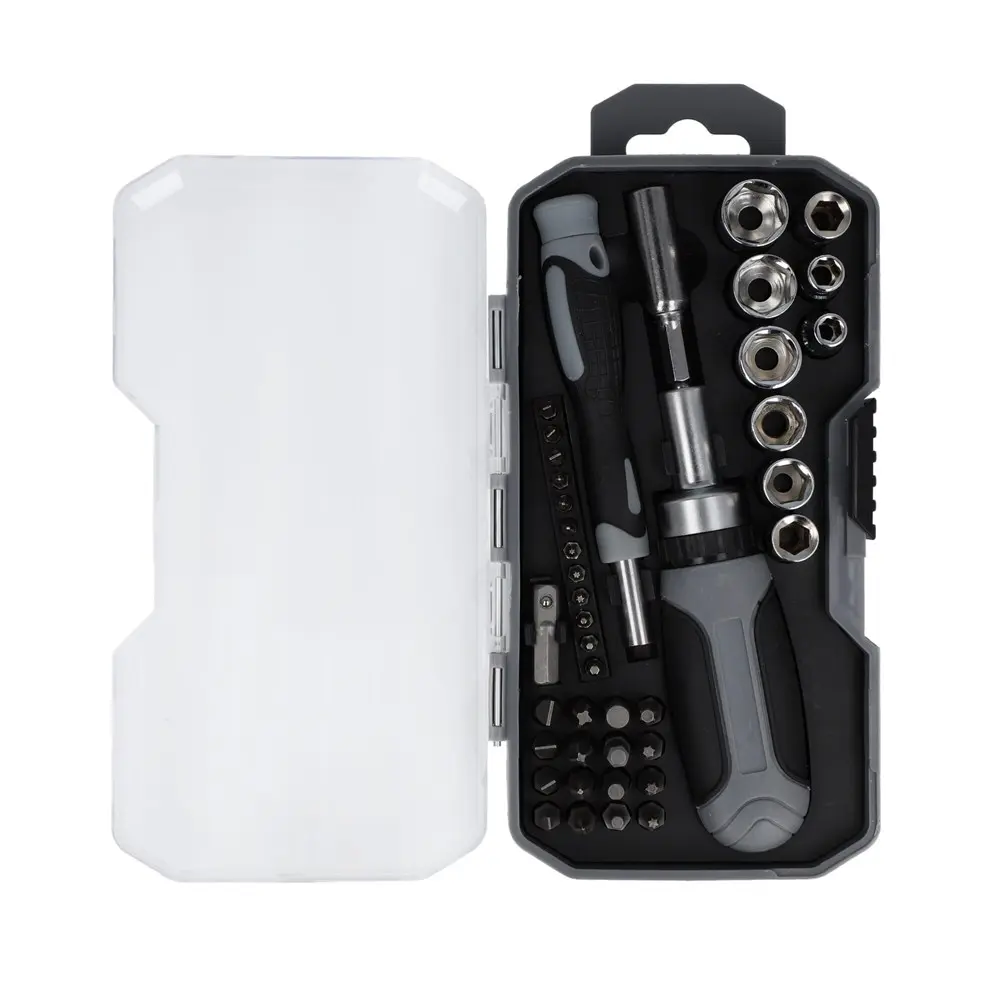 Ontdek onze 41-delige gereedschapsset, ideaal als gepersonaliseerd relatiegeschenk voor uw bedrijf. Met 1 schroevendraaieraansluiting van 60 mm, 1 handgreep, 1 ratelschroevendraaier, 1 24 mm AD-adapter, 9 doppen van 1/4 inch, 16 bits van 25 mm en 12 bits van 28 mm biedt deze set veelzijdige gereedschappen voor alledaagse klussen. Personaliseer met uw logo om uw merk te versterken bij events of als promotie voor uw klanten. De set voldoet aan Amfori BSCI-normen voor duurzame productie. Perfect voor marketingteams en eventorganisatoren die kwalitatieve, praktische geschenken zoeken om relaties te bouwen.