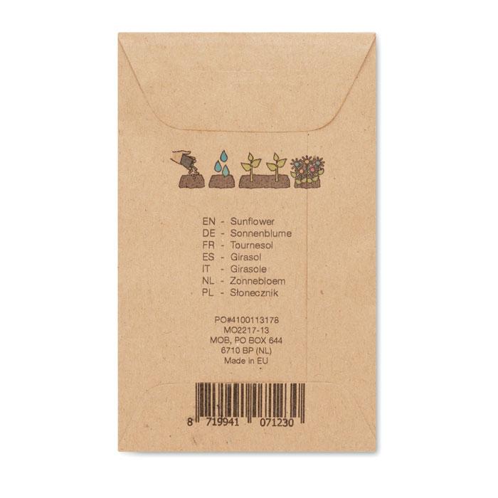 Ontdek de GIRASOL zonnebloemzaadjes in een stevige krafpapieren envelop – perfect als gepersonaliseerd relatiegeschenk met jouw logo. Deze Helianthus debilis zaadjes groeien uit tot vrolijke zonnebloemen, ideaal voor duurzame promotie.
