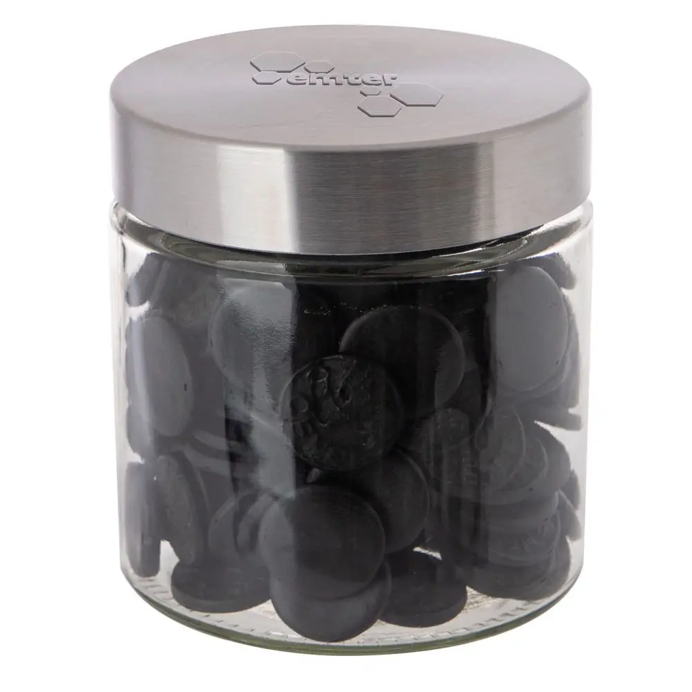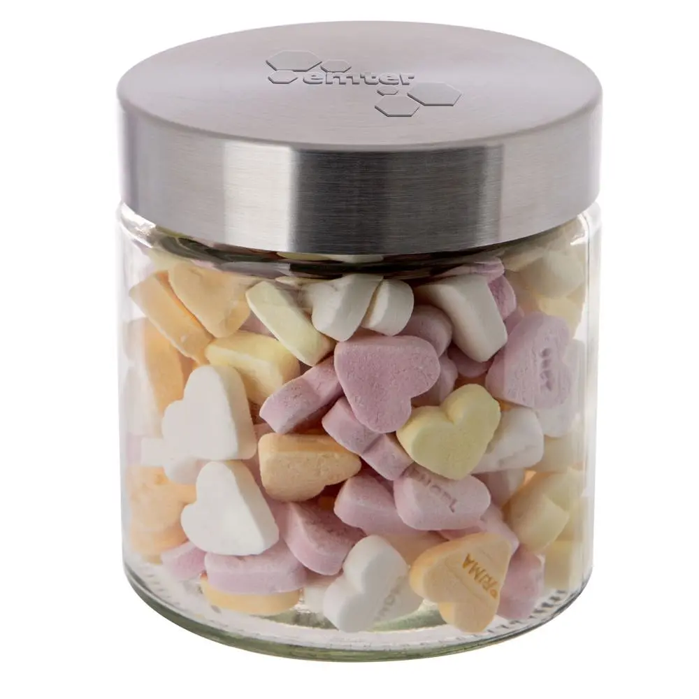 Ontdek deze stijlvolle glazen pot met een robuust RVS deksel van 0,9 liter capaciteit. De pot is gemaakt van hoogwaardig glas met een diameter van 110 mm en voorzien van embossing op het deksel. Hij is gevuld met smakelijke dropstaafjes, wat hem direct aantrekkelijk maakt als give-away.