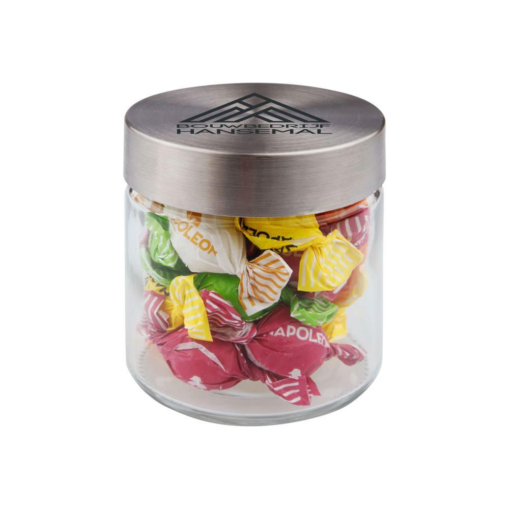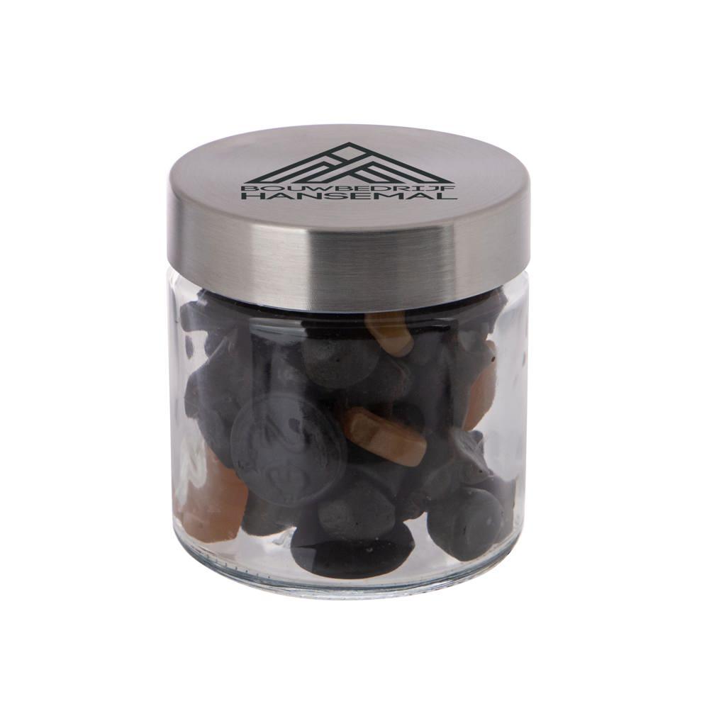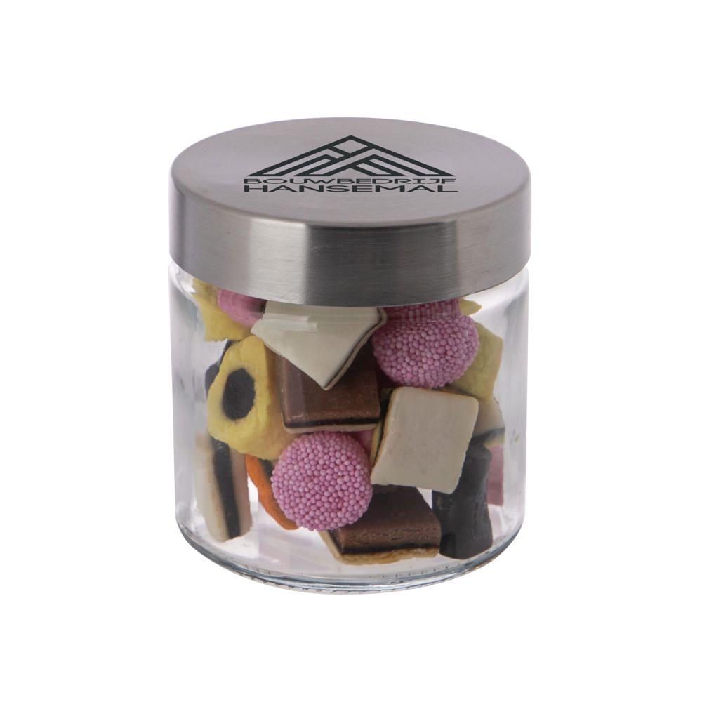 Glazen pot met RVS deksel 0,35 liter voorzien van een full colour digitale bedrukking op het deksel en gevuld met metallic sweets