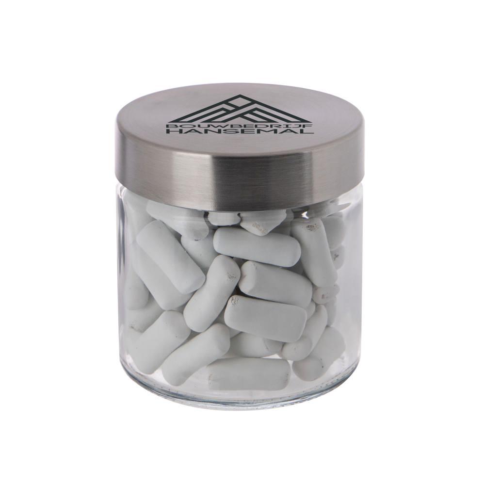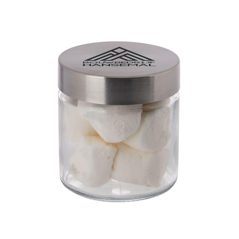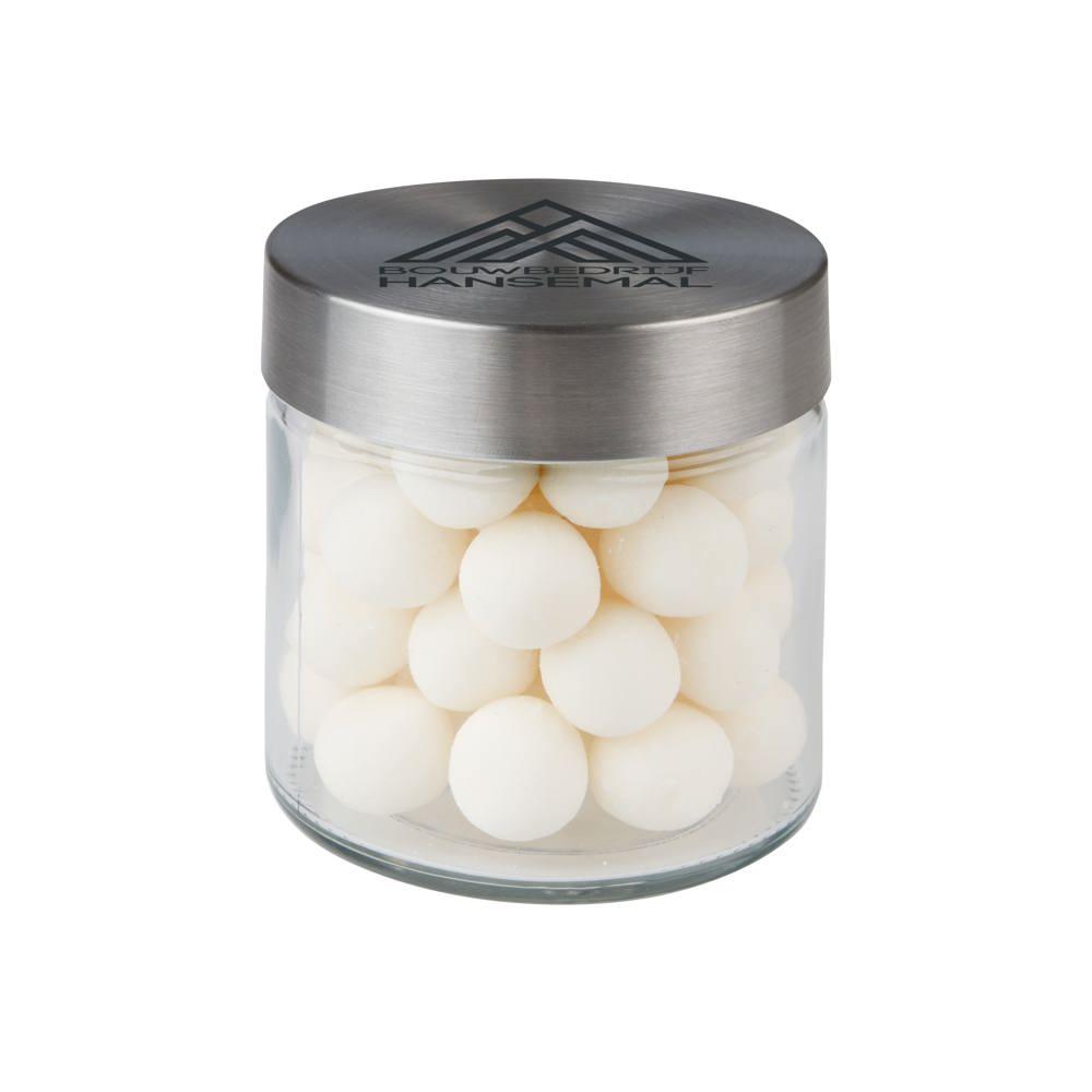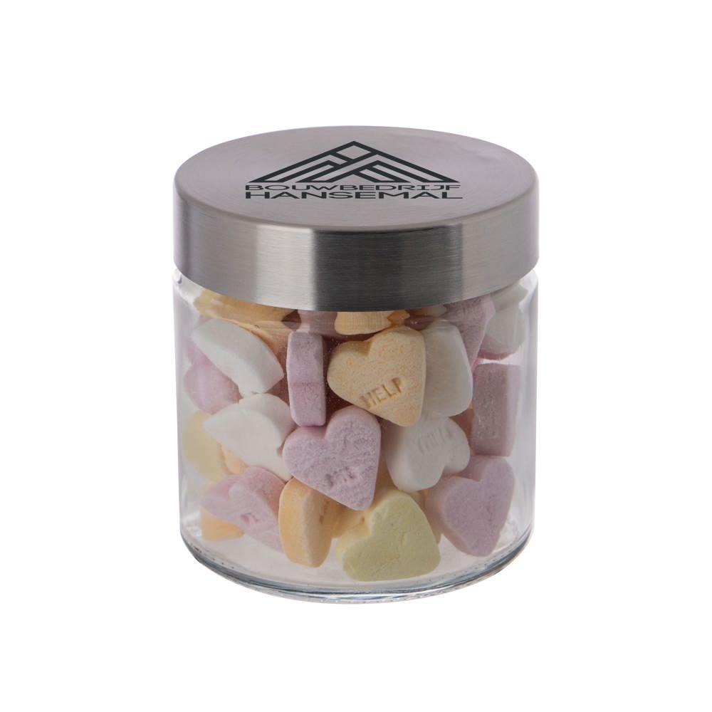 Glazen pot met RVS deksel 0,35 liter voorzien van een full colour digitale bedrukking op het deksel en gevuld met metallic sweets