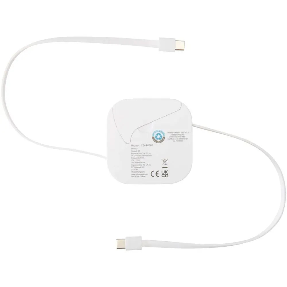 De Gloas 5-in-1 is de ideale gepersonaliseerde relatiegeschenk voor uw marketingcampagnes en events. Gemaakt van gerecycled ABS-kunststof (maat: 6,5 x 2,1 x 6,5 cm), biedt deze duurzame tool een intrekbare 100 W USB-C-snellaad- en datakabel, compleet met USB-A-adapter en 2-in-1 microUSB-/Lightning-adapter. Laad laptops, tablets en smartphones razendsnel op, en synchroniseer data moeiteloos – perfect compatibel met CarPlay en Android Auto.