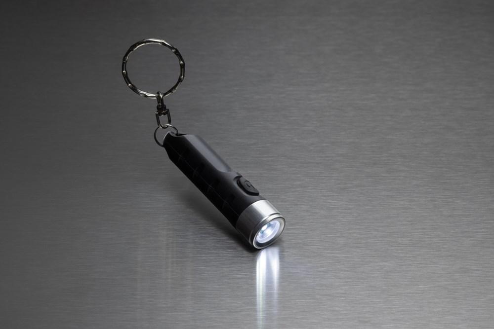 Ontdek deze praktische oplaadbare usb-sleutelhangerzaklamp, perfect als gepersonaliseerd relatiegeschenk met jouw logo. Gemaakt van RCS-gerecycled ABS met 33% totaal gerecycled materiaal, PVC-vrij en met gecertificeerde toeleveringsketen voor een duurzaam imago.