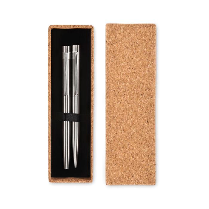 Duik in de wereld van duurzame relatiegeschenken met deze gerecyclede roestvrijstalen pennenset. Je krijgt een balpen en rollerbal in een bijpassende kurken doos. Kurk is een natuurlijk hernieuwbaar materiaal dat bijdraagt aan een eco-vriendelijke uitstraling.