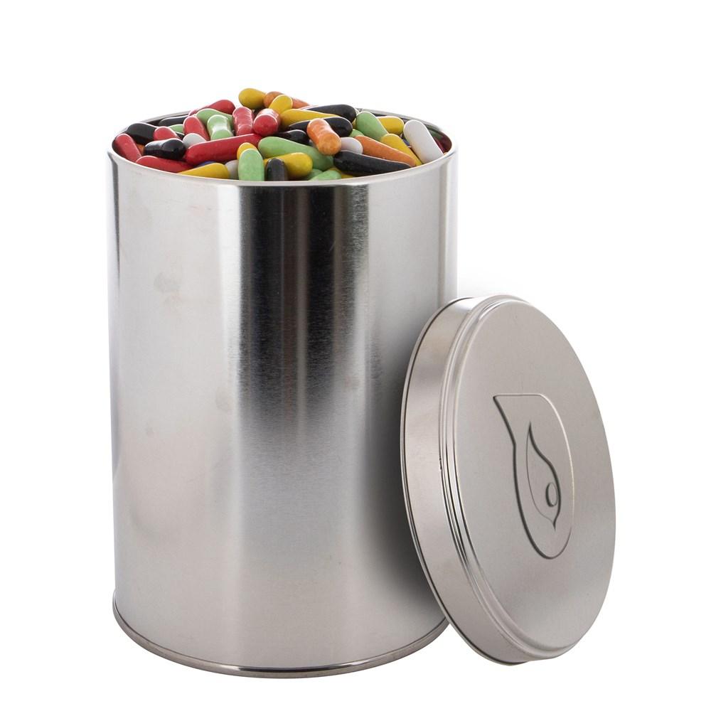 Groot blik 1,3 liter voorzien van embossing op het deksel en gevuld met ca. 485 gram Metallic Sweets
