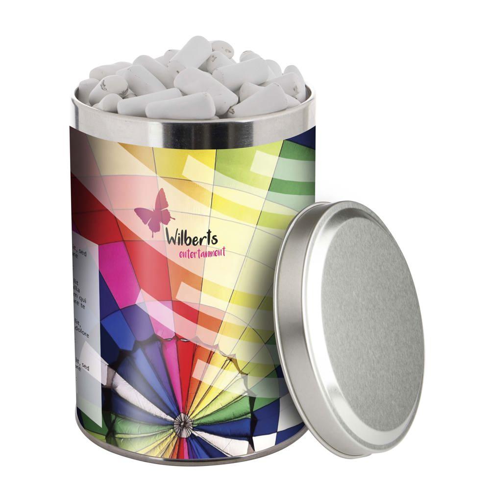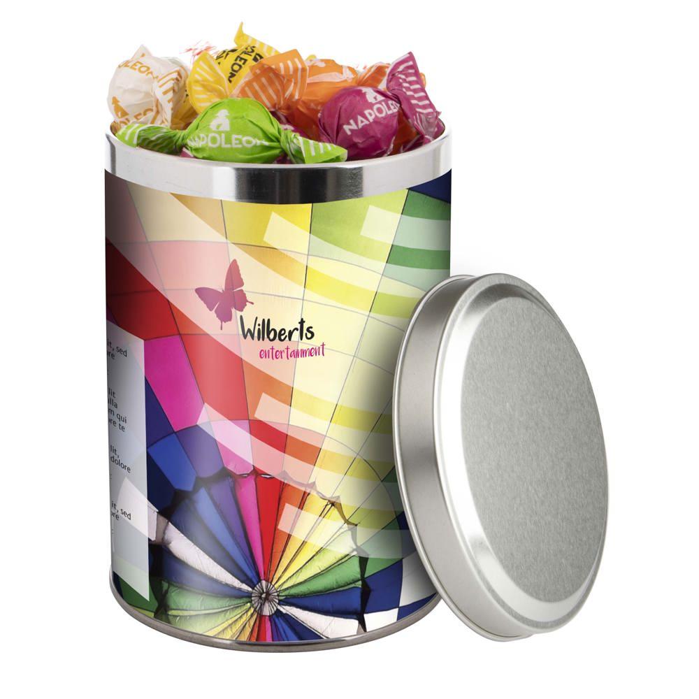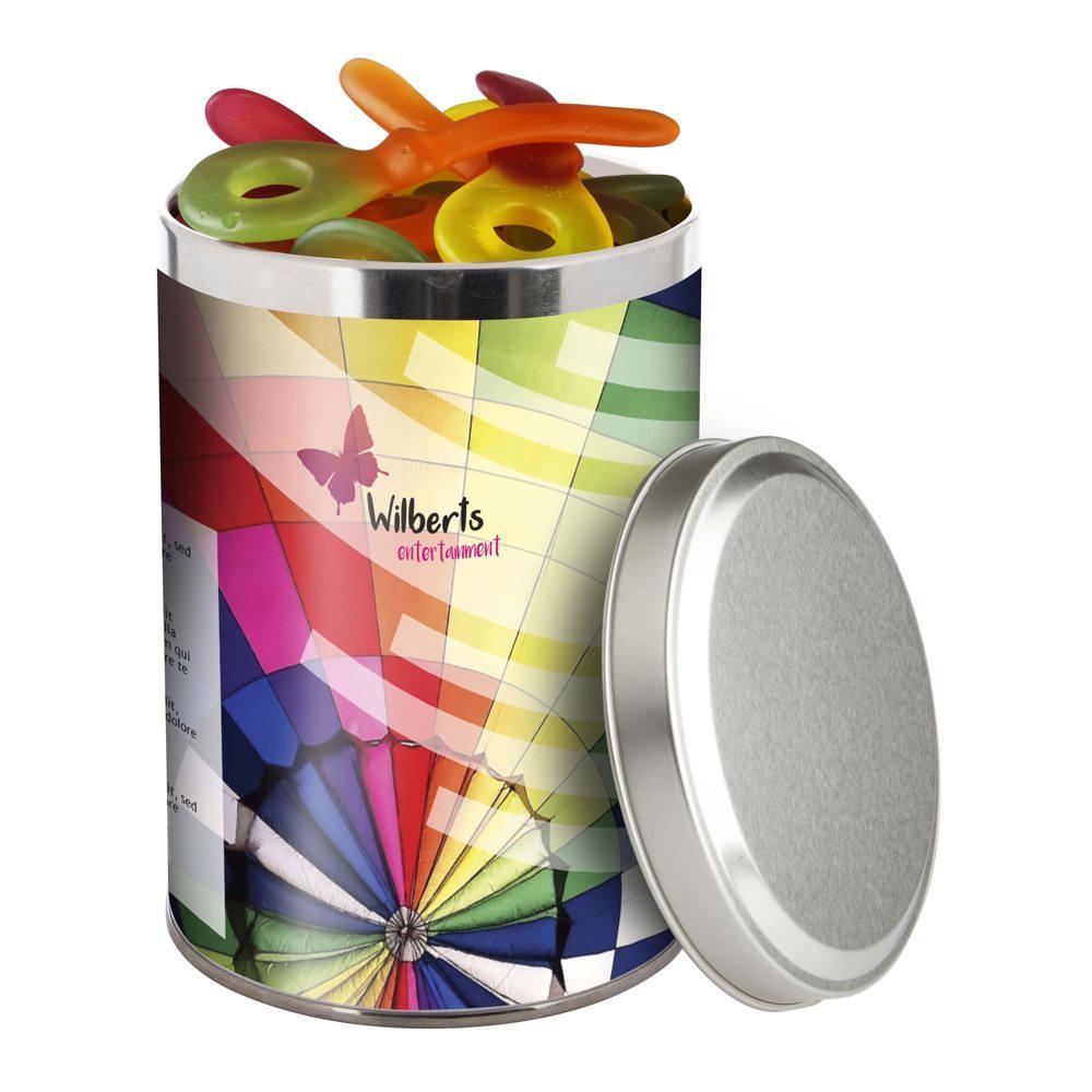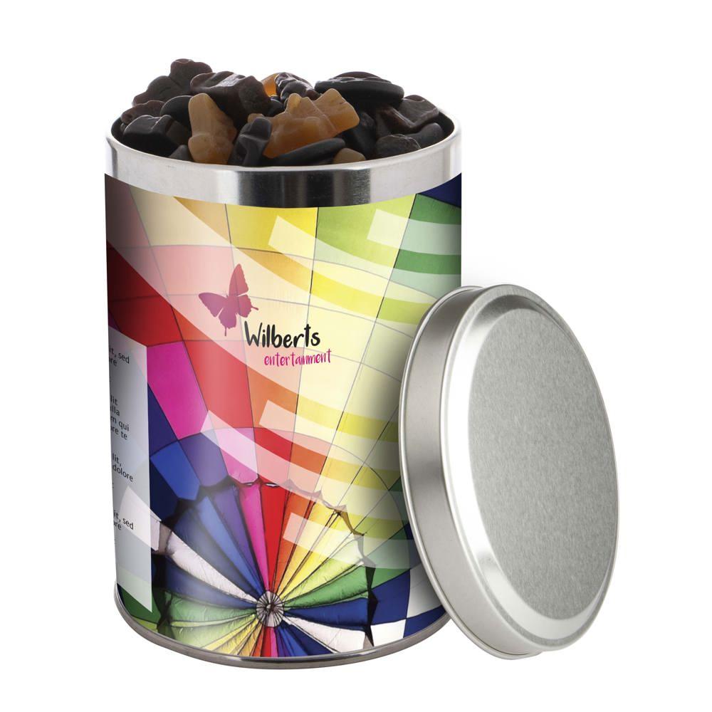 Je ontvangt een groot blik van 1,3 liter met een diameter van 108 mm, gevuld met ongeveer 485 gram smakelijke snoep. De sleeve is full colour bedrukt met jouw logo of ontwerp, zodat je merk opvalt bij elke ontvanger.
