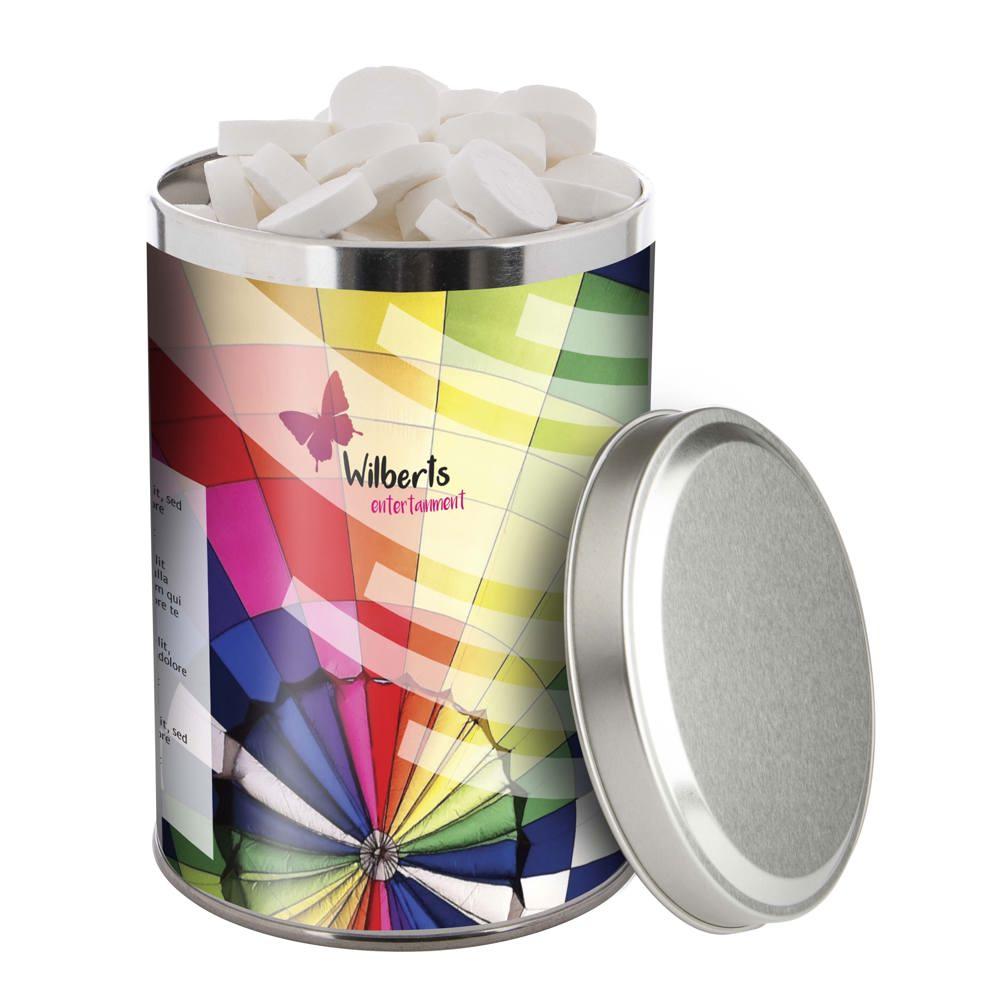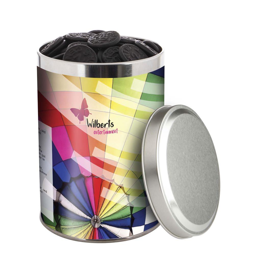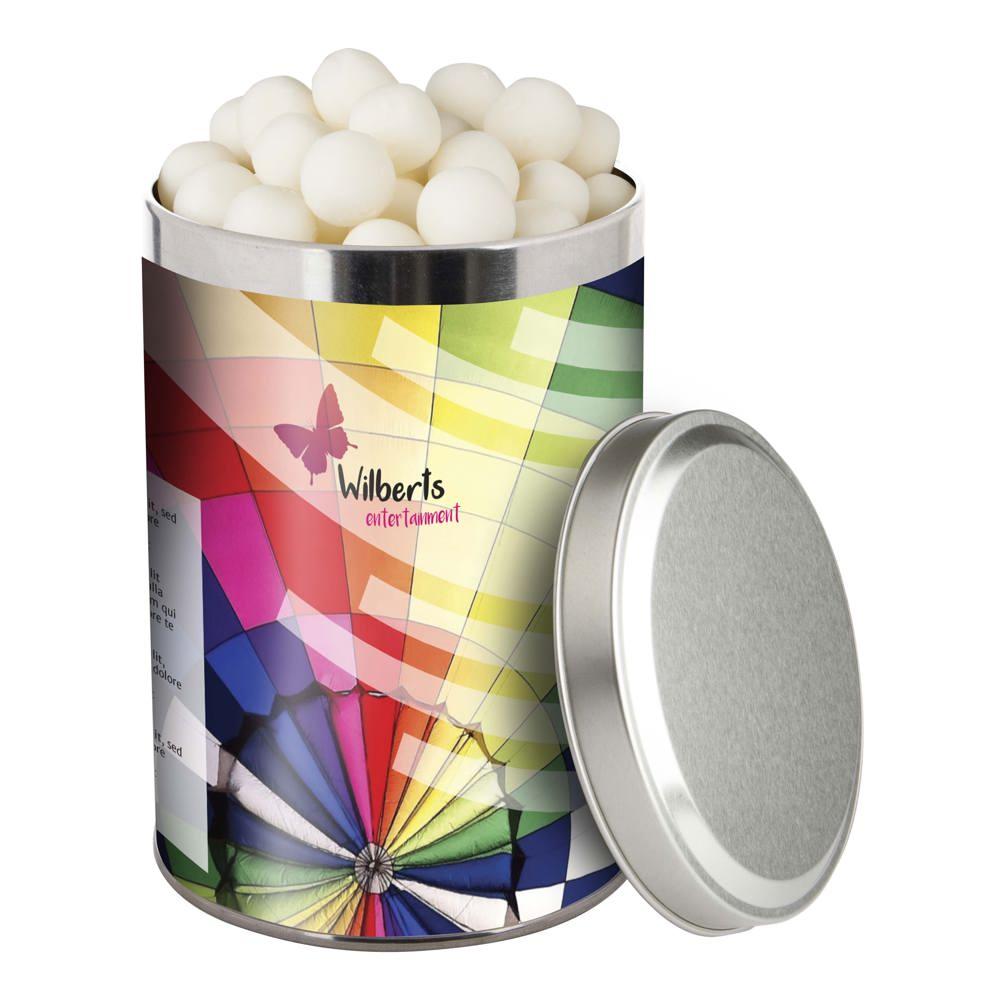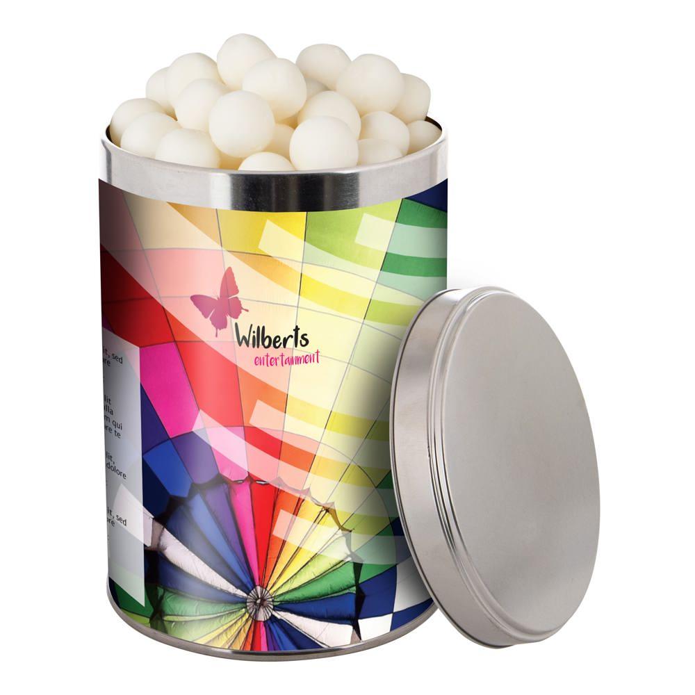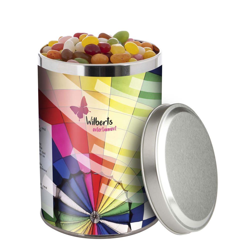 Je ontvangt een groot blik van 1,3 liter met een diameter van 108 mm, gevuld met ongeveer 485 gram smakelijke snoep. De sleeve is full colour bedrukt met jouw logo of ontwerp, zodat je merk opvalt bij elke ontvanger.