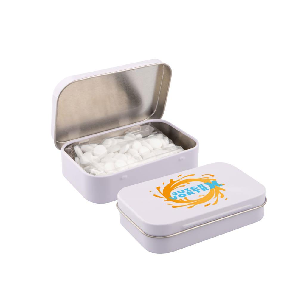 Groot scharnierblik wit met ca. 60 gram suikervrije pepermunt in een zakje en voorzien van een full colour bedrukking. Inclusief ingrediëntensticker en seal.