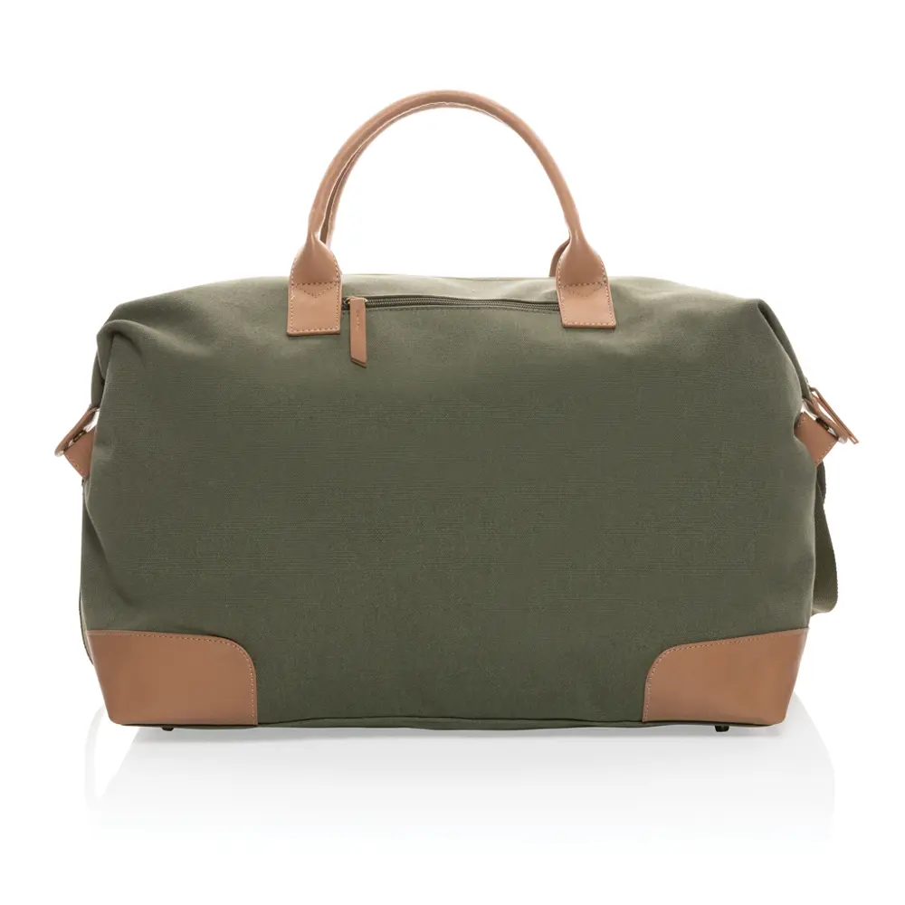 Ontdek de grote canvas weekendtas als ideaal gepersonaliseerd relatiegeschenk voor uw bedrijf. Met een inhoud van 40 liter biedt deze tas één groot hoofdcompartiment en een handig voorvak, perfect voor een weekend vol essentials. De stevige PU-handvatten zorgen voor comfortabel dragen, terwijl vier messing noppen de onderkant beschermen tegen vuil op de grond.