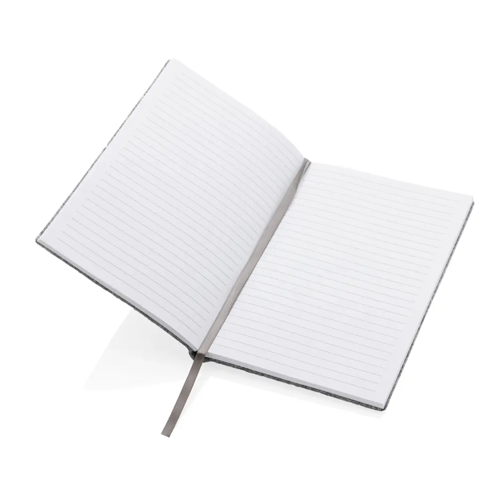 Ontdek ons vilten A5 notitieboek, ideaal als gepersonaliseerd relatiegeschenk voor uw bedrijf. Gemaakt van 100% GRS-gecertificeerd gerecycled vilt en papier, met 99% gerecycled materiaal, voldoet het aan strenge normen zoals de AZO-kleurstoffen- en PCP-richtlijnen. Dit duurzame notitieboek biedt 80 vellen (160 gelinieerde pagina's van 70 g/m²), perfect voor notities tijdens events of als branded giveaway.