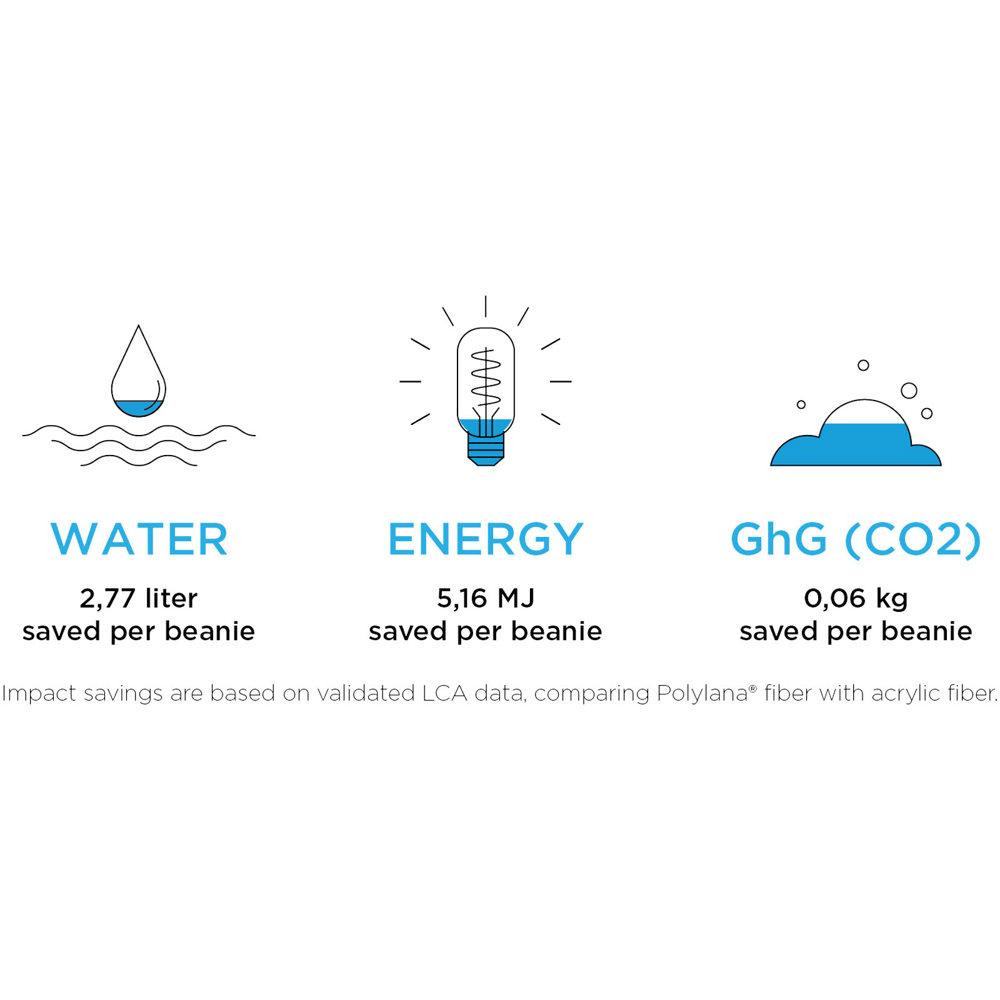 Ontdek de Hale beanie, gemaakt van Polylana® vezel – een slim, milieuvriendelijk alternatief voor acryl- en wolvezels. Je spaart hiermee water, energie en CO2 tijdens productie en verven. Per beanie realiseer je concrete besparingen: 2,77 liter water, 5,16 MJ energie en 0,06 kg GHG (CO2). Deze cijfers komen uit gevalideerde Life Cycle Assessment (LCA)-data.