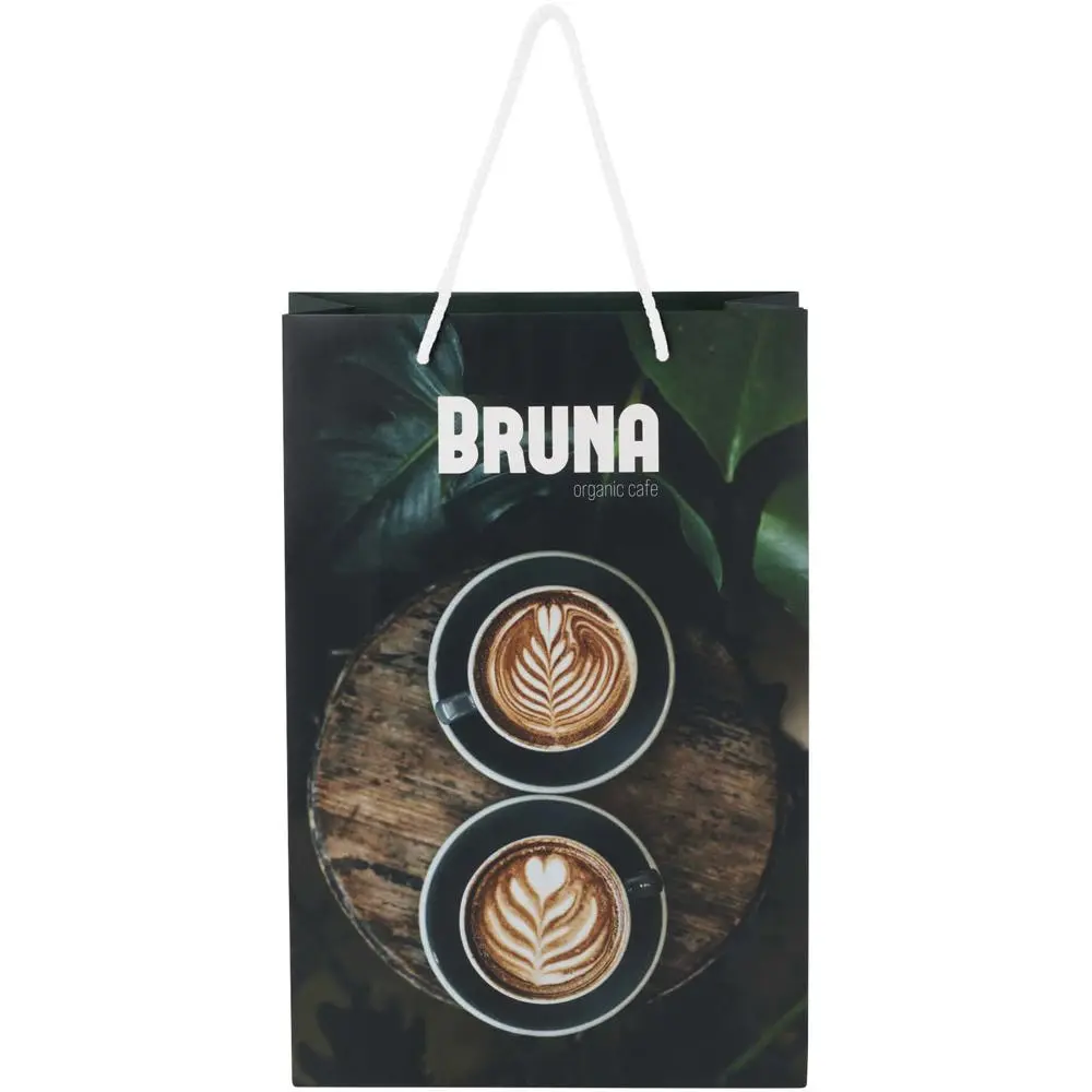 Ontdek de grote handgemaakte matte integra papieren tas met afmetingen van 24 x 9 x 36 cm. Gemaakt van gelamineerd papier met een dikte van 170 g/m² en voorzien van PP woven handgrepen voor extra stevigheid. De aanpasbare voor- en achterkant bieden ruime mogelijkheden voor logobedrukking of een uniek ontwerp, ideaal voor uw marketingdoeleinden.