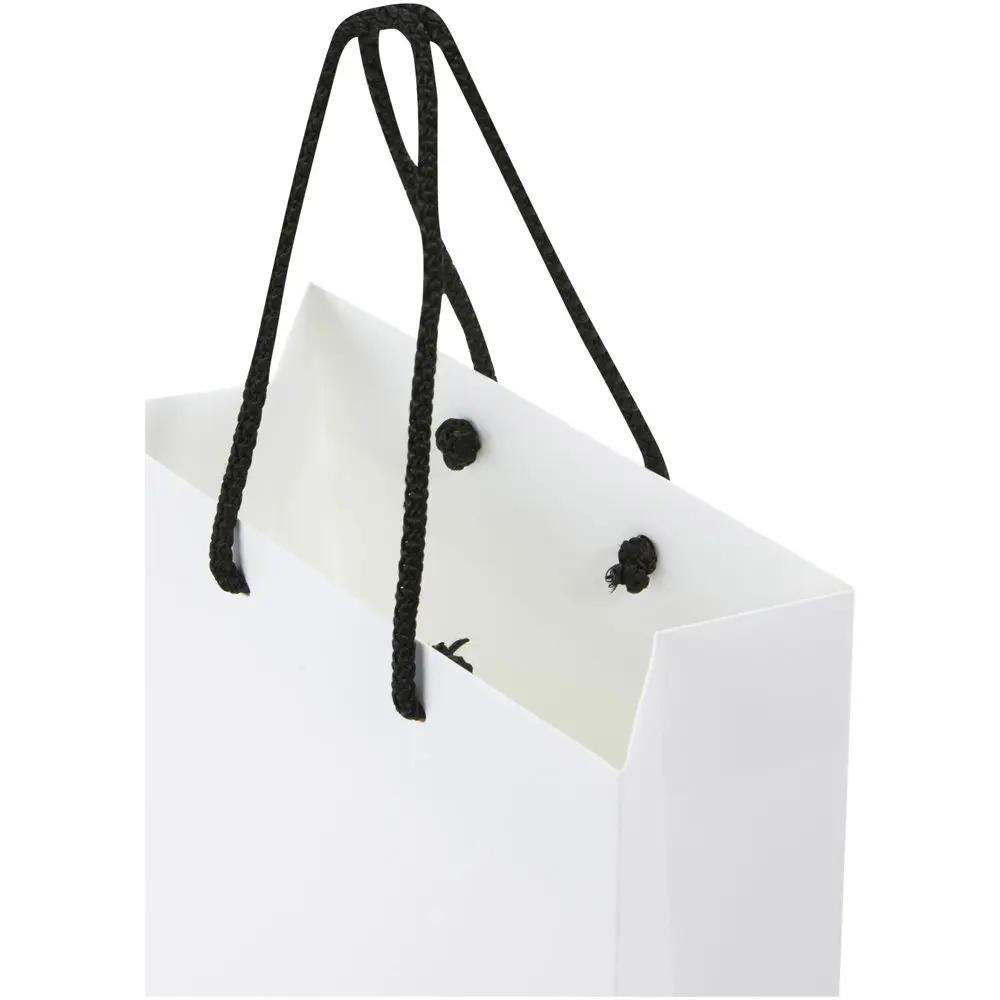 Ontdek deze medium handgemaakte matte integra papieren tas, ideaal als gepersonaliseerd relatiegeschenk. Met afmetingen van 18 x 9 x 23 cm biedt ze voldoende ruimte voor uw promotiemateriaal. De tas is vervaardigd uit 170 g/m² gelamineerd papier, wat zorgt voor een stevige en kwalitatieve uitstraling.
