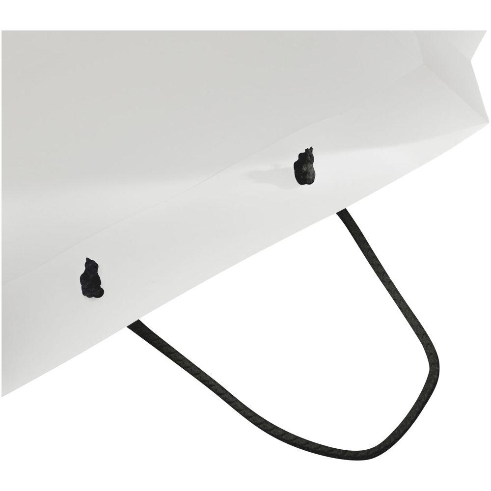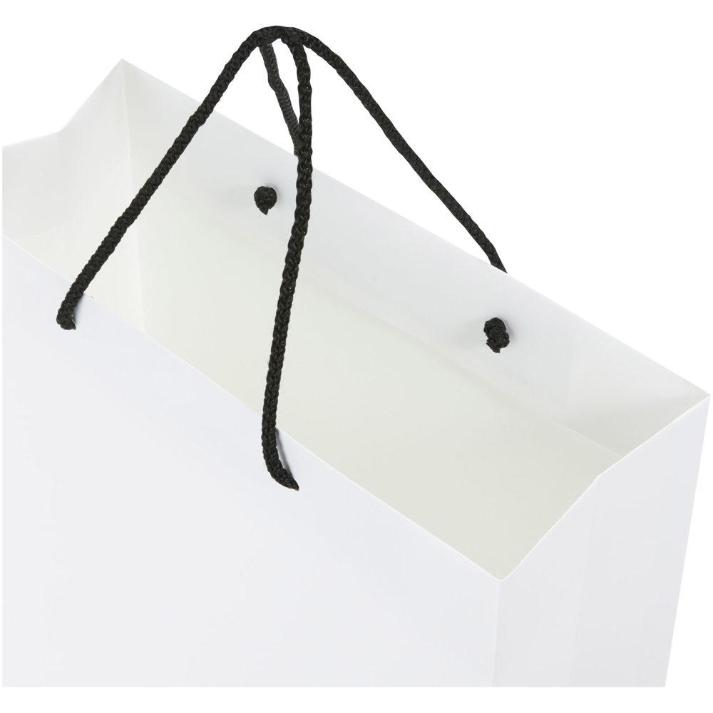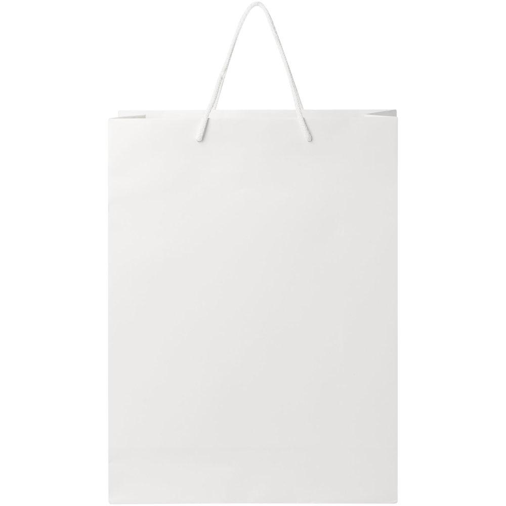 XL handgemaakte matte integra papieren tas (31 x 12 x 41 cm) van 170 g/m2 met PP woven handgrepen. De aanpasbare voor- en achterkant bieden voldoende ruimte voor het afdrukken van een logo of een ander ontwerp, waardoor het een uitstekende zakelijke marketingtool is. Gemaakt in Europa en 100% recyclebaar.